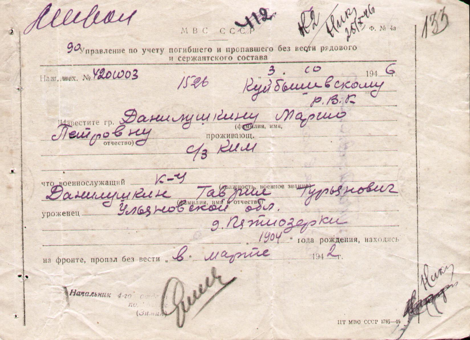 Опубликовано 8 июня, 2009 - 11:50 пользователем Михаил Черепанов Учетные данные г.р.: 1904место рождения: Ульяновская обл.РВК: Куйбышевским РВКзвание: кр-цместо службы: 802 об,п/п 241месяц выбытия: 3год выбытия: 1942причина выбытия: бопись: 18004дело: 2447лист: 315прим.: 1 Комментарии Re: ДАНИЛУШКИН ГАВРИЛ ГУРЬЯНОВИЧ Постоянная ссылка (Permalink) Опубликовано 2 декабря, 2013 - 10:44 пользователем Мидхатов Ильхам... Уроженец д. Пятиозерки Мидхатов Войдите или зарегистрируйтесь, чтобы отправлять комментарии