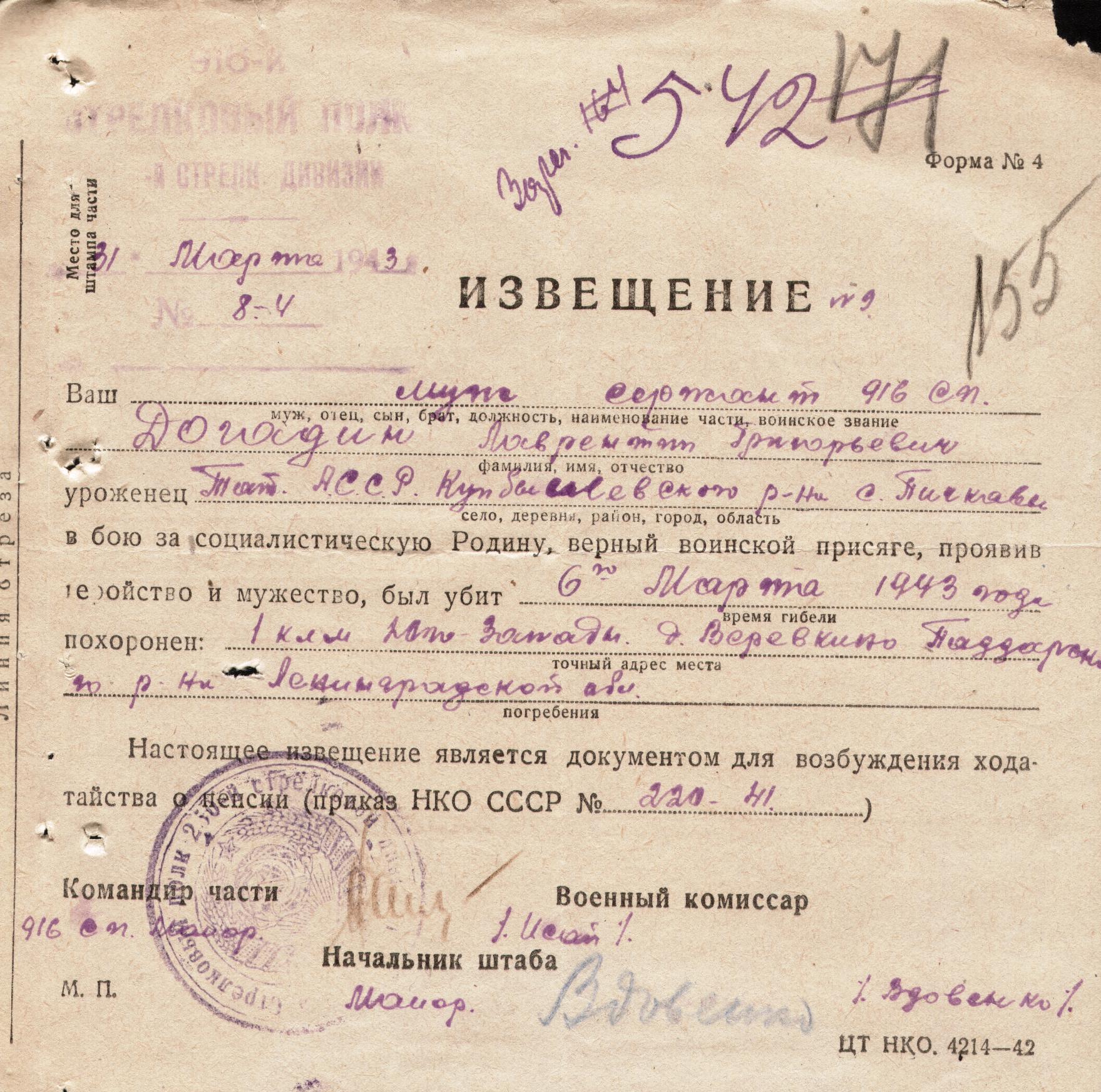 Дата выбытия 06.03.1943