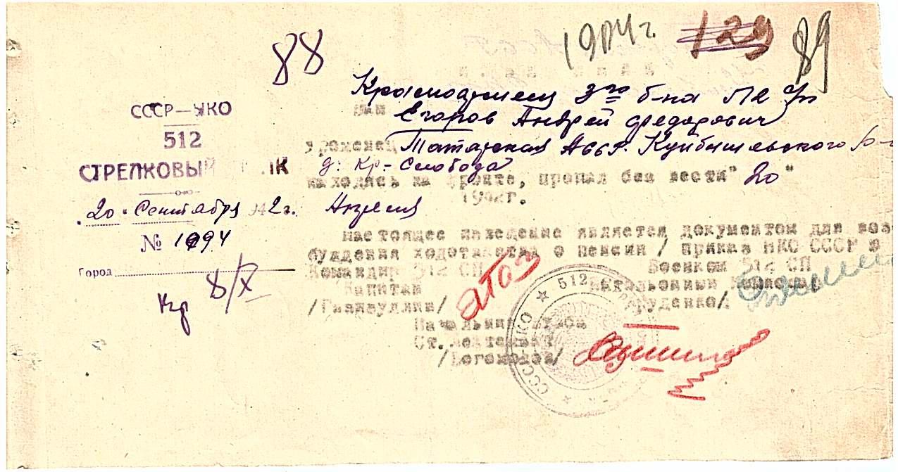 Место рождения Татарская АССР, Куйбышевский р-н, д. Кр.-Слобода
