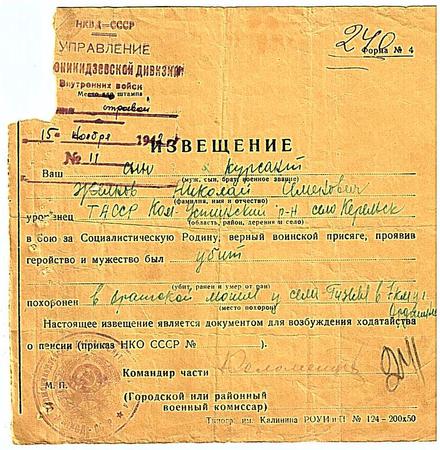 Опубликовано 8 июня, 2009 - 11:50 пользователем Михаил Черепанов Учетные данные г.р.: 1919место рождения: п.Кирельское(Куйб.ЗаРВК: Камско-Устьинским РВКзвание: замполитдень выбытия: 4месяц выбытия: 11год выбытия: 1942причина выбытия: побл. выбытия: Орджоникидзевский крместо выбытия: д.Гизель(г.Ордженикидзе)госпиталь: 68 п НКВДприм.: 0 Комментарии Re: ЖЕЛНОВ НИКОЛАЙ СЕМЕНОВИЧ Постоянная ссылка (Permalink) Опубликовано 28 ноября, 2013 - 19:57 пользователем Мидхатов Ильхам... Мидхатов Войдите или зарегистрируйтесь, чтобы отправлять комментарии