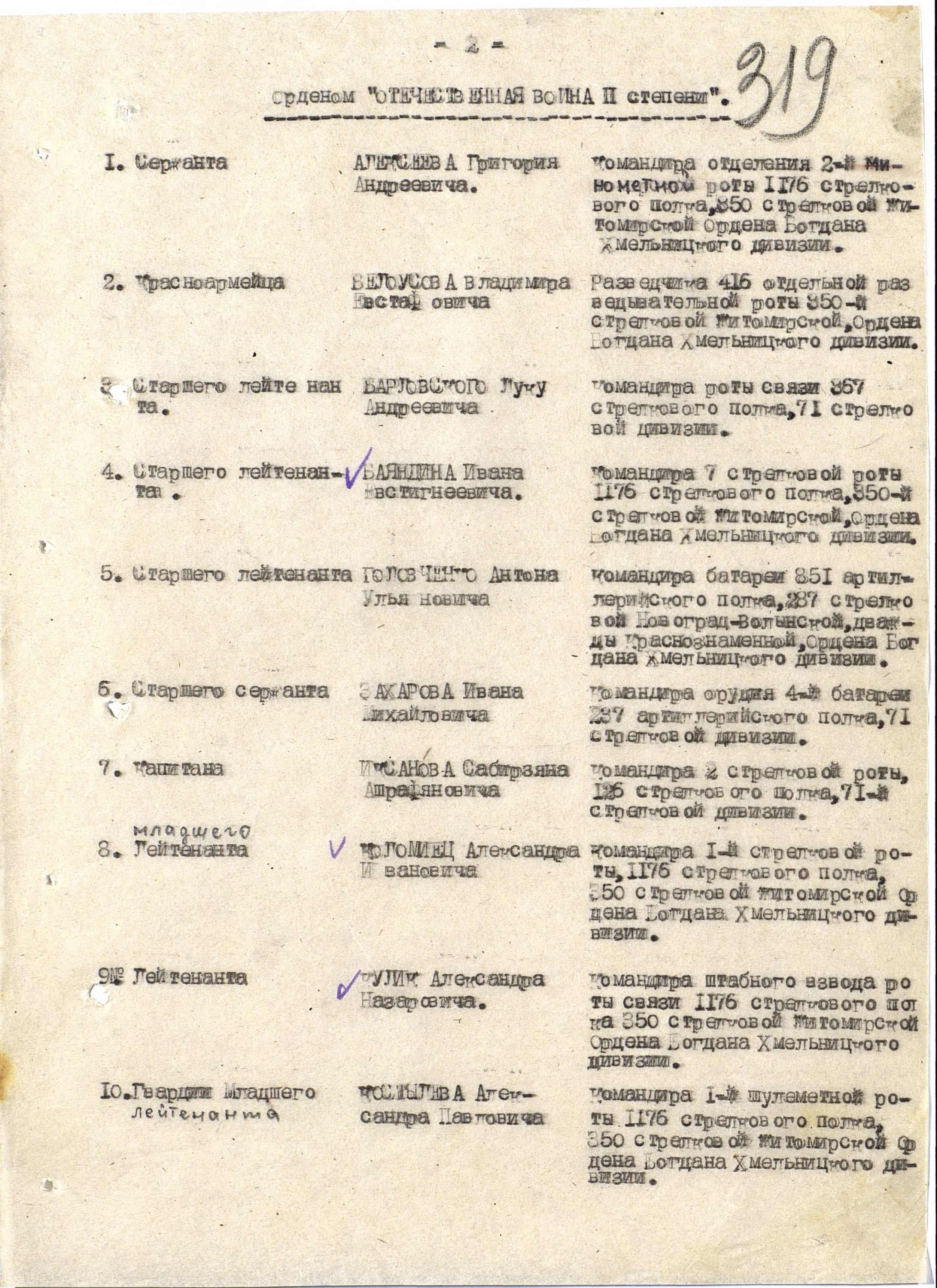 Награжден: Орден Отечественной войны II степени (ПОСМЕРТНО – приказ 33/н12.08.1944).