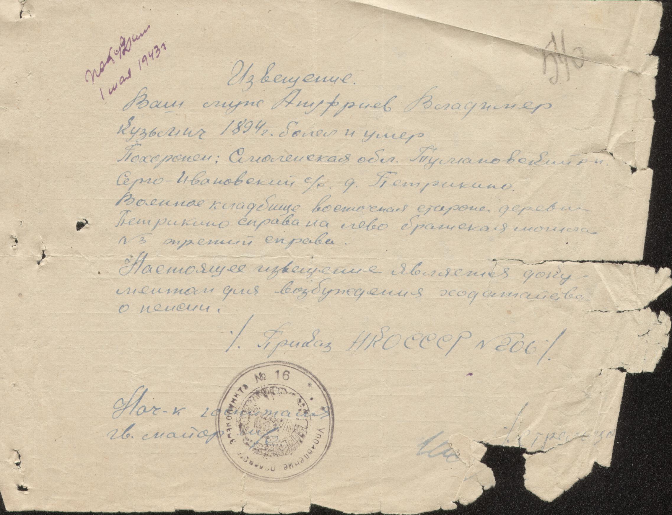 Первичное место захоронения Смоленская обл., Тумановский р-н, Серго-Ивановский с/с, д. Петрикино, воен. кладбище, восточная сторона, справа налево братская могила № 3 третий справа