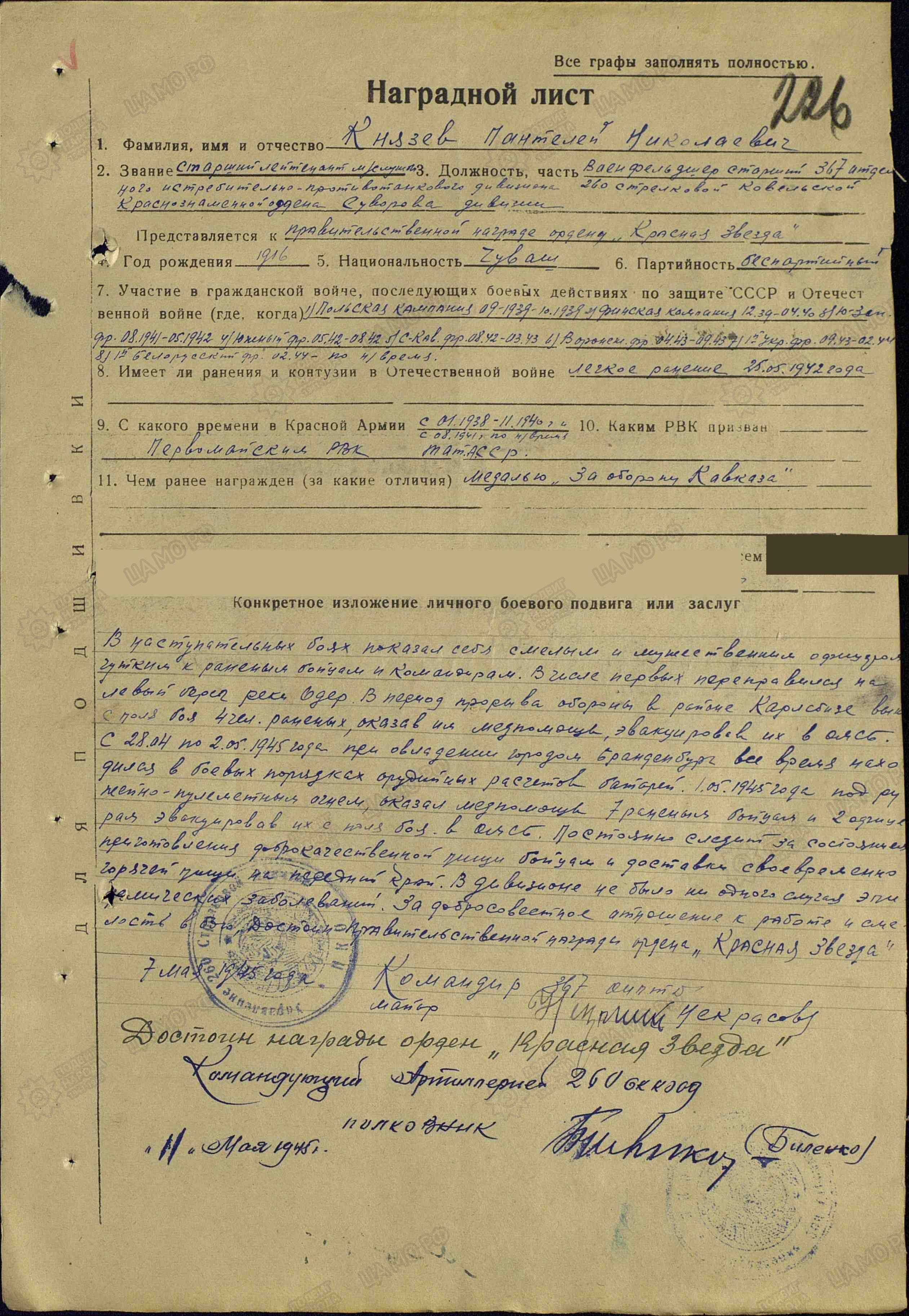 1. Распечатки наградных документов из базы Подвиг Народа (Орден Красной Звезды, Медаль «За оборону Кавказа»);