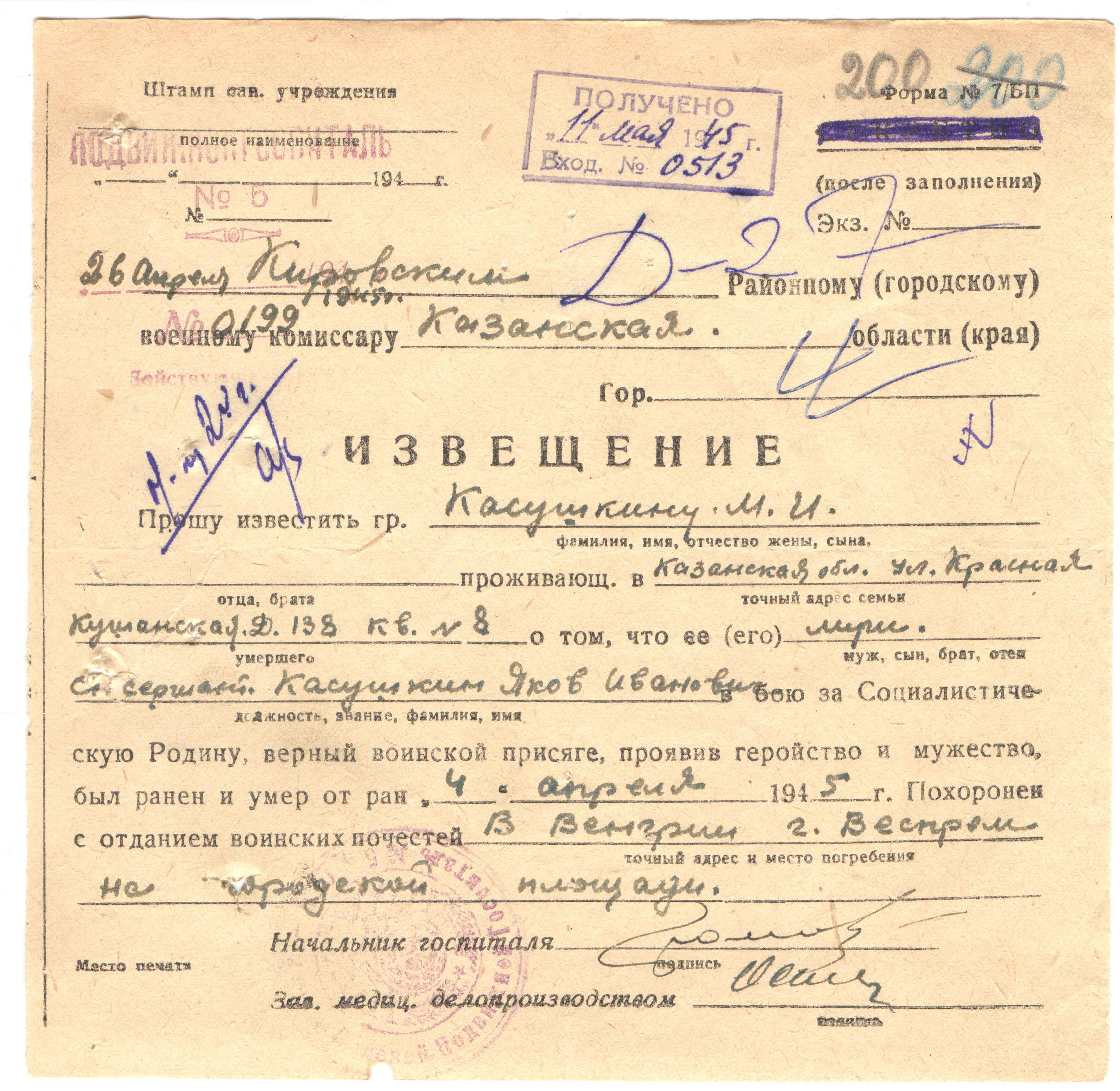 Дата и место призыва __.__.1941, Кировский РВК, Татарская АССР, г. Казань, Кировский р-н