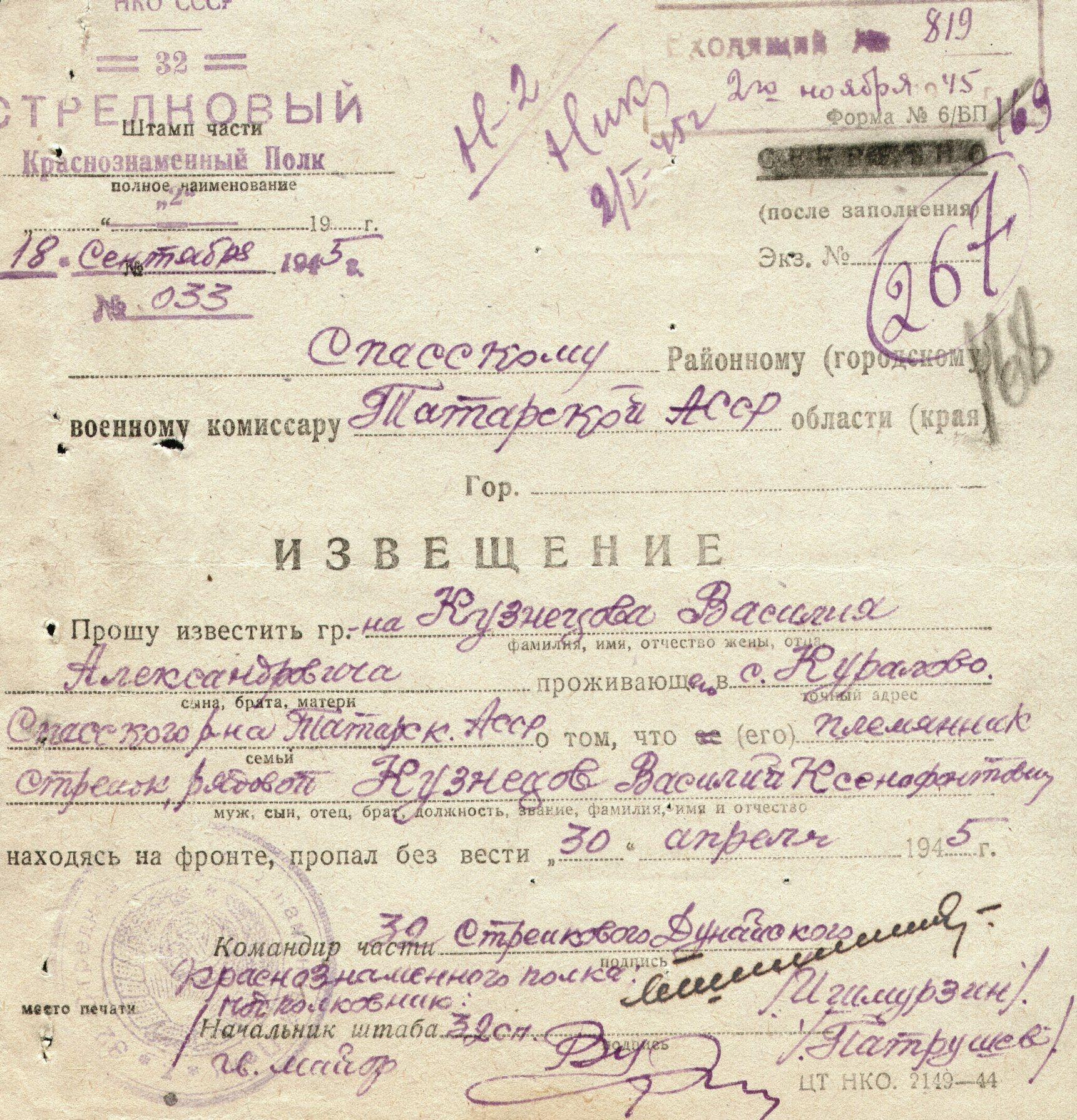 Дата выбытия 30.04.1945
