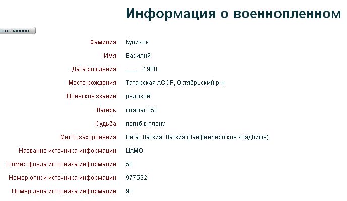 Опубликовано 8 июня, 2009 - 11:50 пользователем Михаил Черепанов Учетные данные г.р.: 1900область рождения: Татарская АССРместо рождения: Октябрьский р-н, с.БогдашкиноРВК: Октябрьский РВКзвание: кр-цместо службы: 68 спдень выбытия: 9месяц выбытия: 11год выбытия: 1941причина выбытия: погиб в пленуобл. выбытия: Латвияместо выбытия: шталаг 350, г.Рига, Зайфенбергское кладбищеопись: ЦАМО РФ, ф.58, оп.977532дело: 98прим.: ОБД-Мемориал Комментарии Re: КУЛИКОВ ВАСИЛИЙ ФЕДОРОВИЧ Постоянная ссылка (Permalink) Опубликовано 5 ноября, 2010 - 19:15 пользователем Alfia-Minnullina Было так: КУЛИКОВ ВАСИЛИЙ ФЕДОРОВИЧ 8 Июнь, 2009 - 10:50 — Черепанов прим.: 0 г.р.: 1902 место рождения: с.Богдашкино РВК: Октябрьским РВК звание: кр-ц причина выбытия: п Погиб в плену: Альфия Миннуллина Войдите или зарегистрируйтесь, чтобы отправлять комментарии