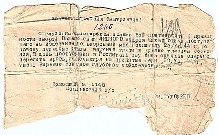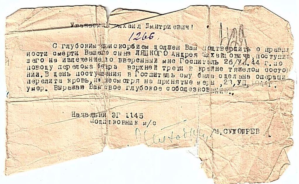 Опубликовано 8 июня, 2009 - 11:50 пользователем Михаил Черепанов Учетные данные РВК: Куйбышевским РВКзвание: кр-цместо службы: п/п 1145день выбытия: 28месяц выбытия: 7год выбытия: 1944причина выбытия: бприм.: 0 Комментарии Re: ЛЯЦКОЙ АНДРЕЙ МИХАЙЛОВИЧ Постоянная ссылка (Permalink) Опубликовано 28 ноября, 2013 - 00:16 пользователем Мидхатов Ильхам... Умер в ЭГ1145 28 июля 1944 года. Мидхатов Войдите или зарегистрируйтесь, чтобы отправлять комментарии