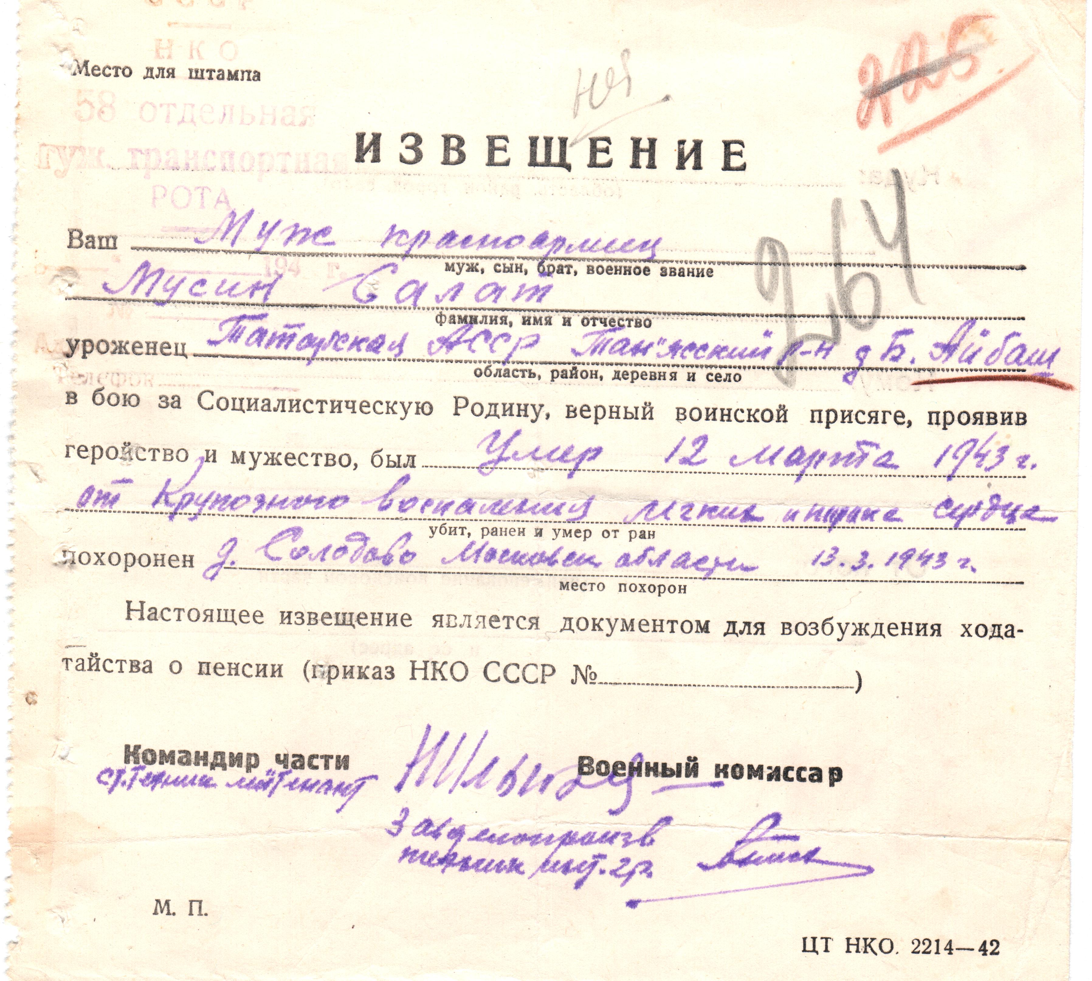 Дата выбытия 12.03.1943