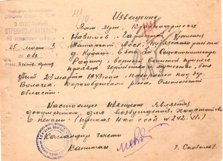 Информация из донесения о безвозвратных потерях Фамилия Назинев Имя Гарафий