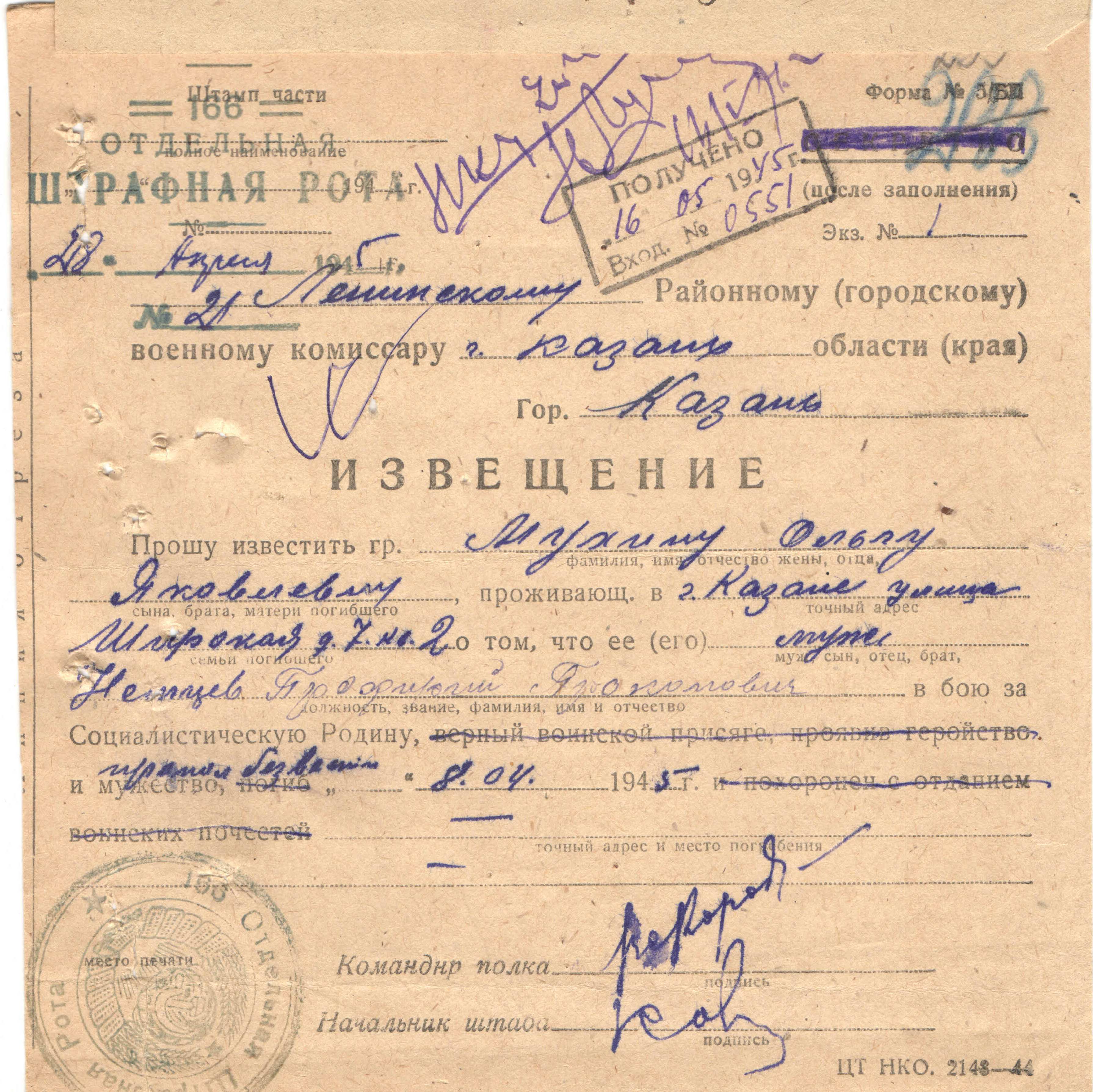 Дата и место призыва __.__.1942, Ленинский РВК, Татарская АССР, г. Казань, Ленинский р-н