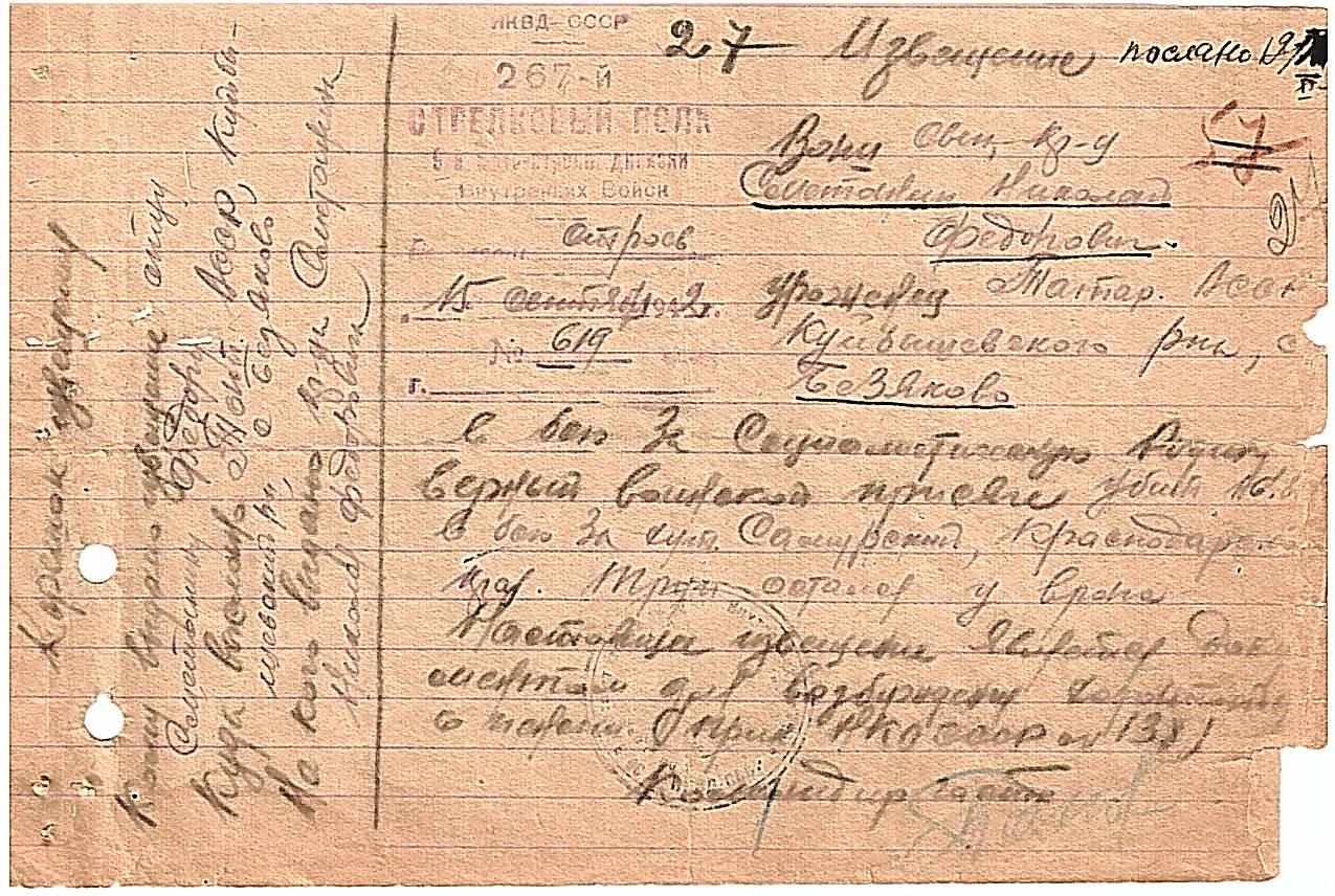 Извещение поступило из 267СП 9 Мото-Стрелковой Дивизии Внутренних Войск. Погиб 18.08.1942 года. Оставлен на поле боя за хутор Самурайский Краснодарского края.