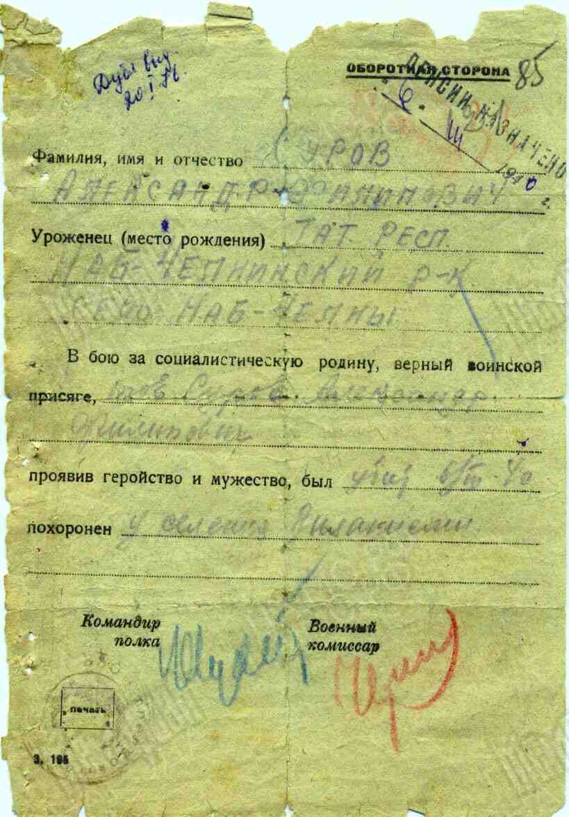 Суров Александр Филимонович родился в 1913 году в Набережных Челнах.До войны работал кузнецом.Женился в 1934 году,а в 1938 у него родилась дочка.В 1939 году его забирают на фронт.6 марта 1940 года приходит информация о том что Александр Суров пропал без вести.Мне удалось найти,что он был похоронен в селе Виланиеми это где-то в Ленинградской области.