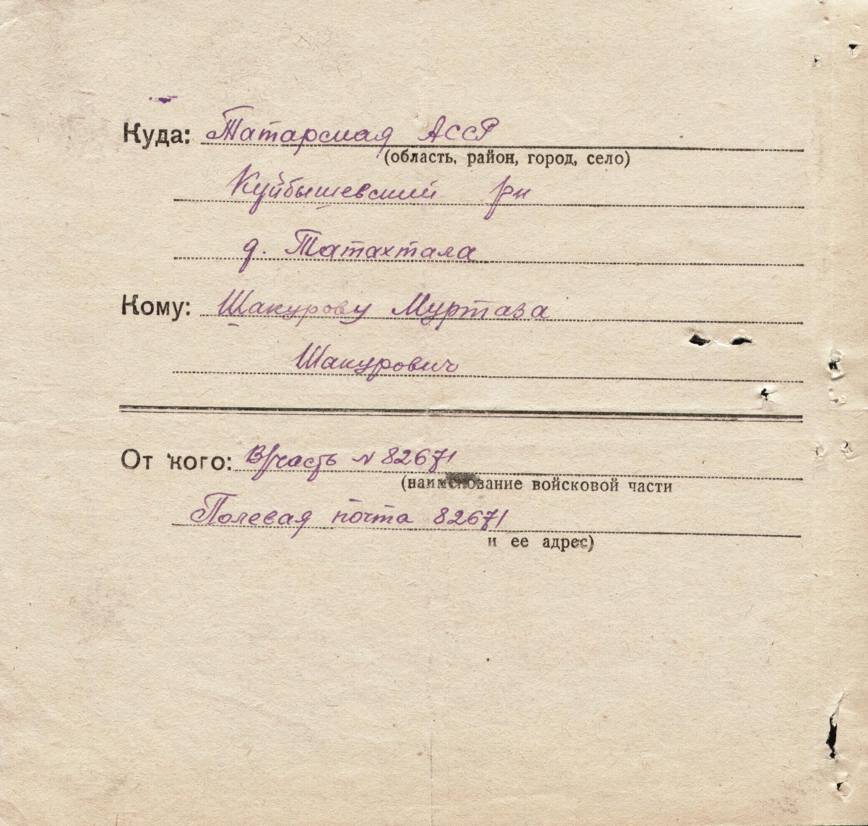 Место рождения Татарская АССР, Куйбышевский р-н, д. Татахтала
