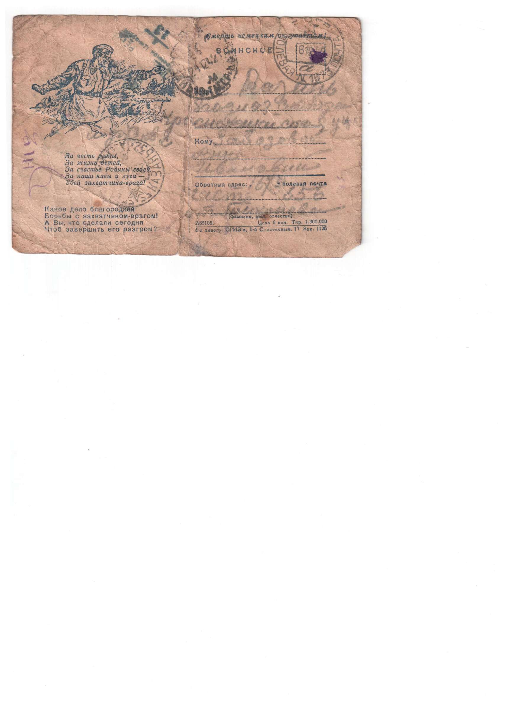 Я не знала, что в Казани есть возможность попытаться что-нибудь узнать об отце, и я обратилась в программу "Жди меня", попросила помочь прочитать почтовую карточку, т.к. она написана карандашом и часть текста прочесть невозможно, а также попытаться найти место гибели отца (хотя бы приблизительно).Пока ответа я не получила.