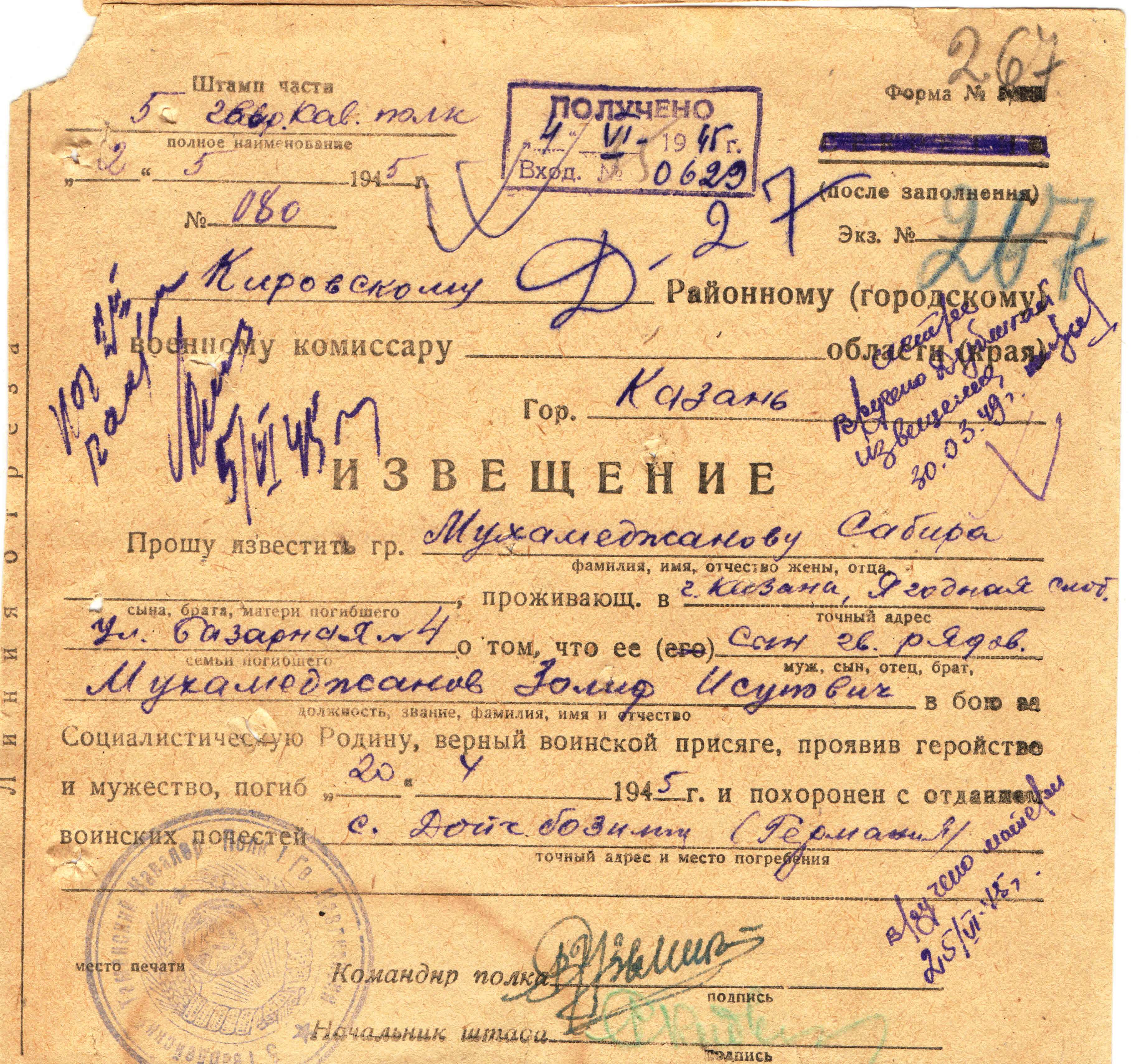 Опубликовано 12 ноября, 2013 - 15:17 пользователем Мидхатов Ильхам... Погиб(ла) Учетные данные место жительства до призыва: г. Казань Ягодная Слободазвание: Гв. рядовойместо службы: 5 Гв. ков. полкдень выбытия: 20месяц выбытия: 4год выбытия: 1945причина выбытия: погибобл. выбытия: Германияместо выбытия: с. Дойчбозилич