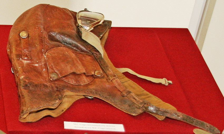Идем к стенду, посвященному легендарным летчицам. На витрине — макет производимого в Казани самолета ПО-2, летный шлем Магубы Хусаиновны Сыртлановой, страницы из ее личной летной книжки, из дневника, фотографии самой героини и ее подруг — гвардии подполковника Анастасии (Надежды) Васильевны Поповой (уроженки Орловской обл.), гвардии капитана Ольги Александровны Санфировой (уроженки Самары, погибшей 13 декабря 1944 г. в белорусском г.Гродно).
