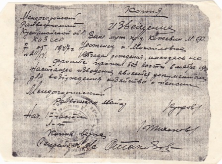 Спасибо,Алёна,за Ваше участие,да это данные моего деда, самые первоначальные, которые мне дал архив министерства обороны. От них отталкивалась я в своём поиске.Многие из этих данных пополнились новой информацией, (например в книге сельского совета КазССр по месту жительства до войны,я нашла дату рождения точную- 21 апреля 1915 года. По последнему месту службы в 731 стрелковом полку, я нашла 205 стрелковую девизию 1 формирования, в состав которой их стрелковый полк воевал с 07.08.1942года по 16августа 1942г., у хутора Венцы Клетского района Волгоградской области, на подступах к Сталинграду. В братской могиле, имя Кожевин М.Ф. не значится, значит есть ещё какие-то варианты поиска захоронения, или поиска в списках солдат, вышедших из окружения (их было 300чел), попавших на расправу к своим же. Поэтому я продолжаю поиск, может быть что - то прояснится? Надеюсь на помощь таких же отзывчивых людей, как Вы!