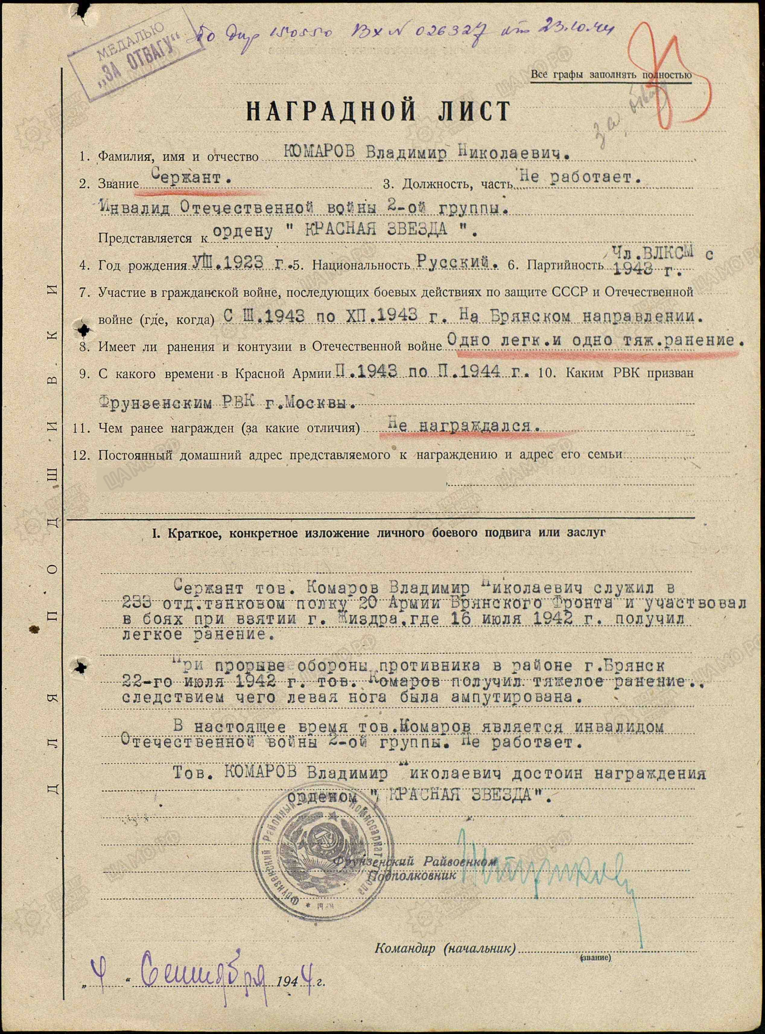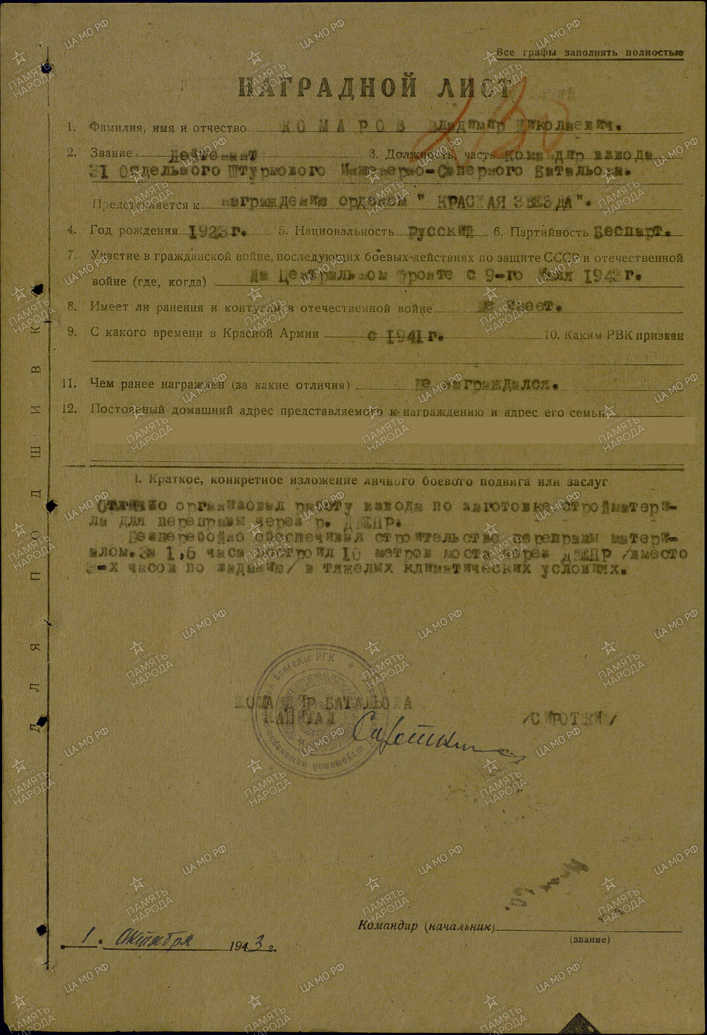 Информация о Комарове В.Н. сайт ПОДВИГ НАРОДА: