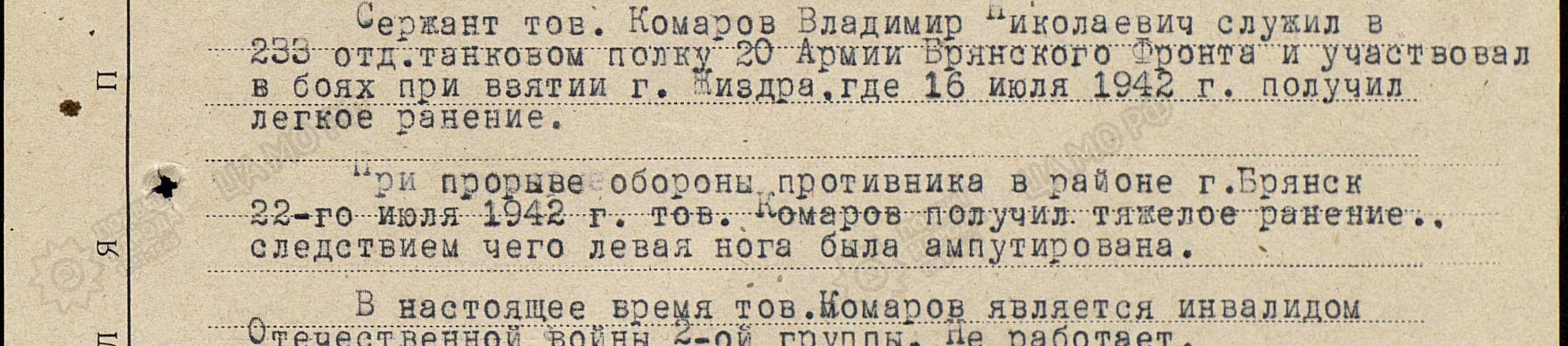 Комаров В.Н. был танкистом (Т-34), прошел не легкий путь на фронте, был ранен и лишился ноги в бою на Курской дуге.