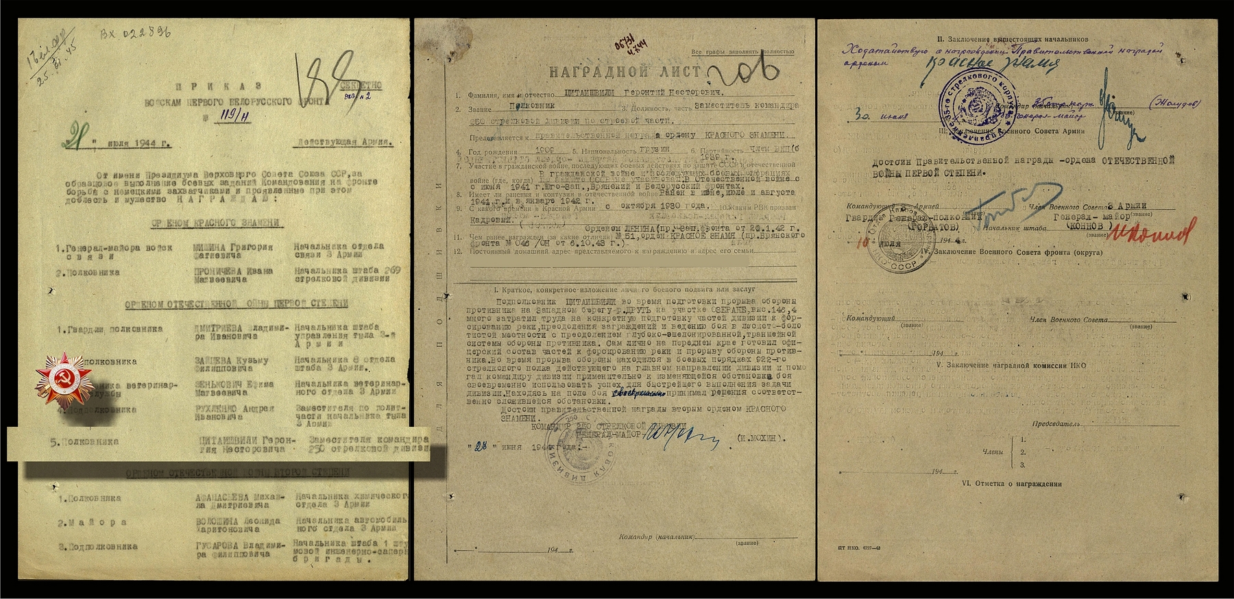 орден Отечественной войны I cтепени (пр.ВС 1БелФ № 119/н от 21.07.1944 г.)