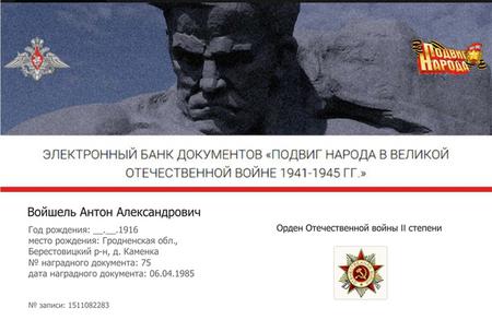 Опубликовано 4 октября, 2015 - 19:28 пользователем Тамара Эйсмонт Вернулся(лась) Учетные данные г.р.: 1916область рождения: Зап.Беларусьместо рождения: Малая Берестовицаместо жительства до призыва: Малая БерестовицаРВК: -----------------------------------звание: Мл.лейтенантдолжность: Командир станковых пулеметов.место службы: Вост.Пруссия,Япония, Награжден орденом Красной Звезды,медаль За взятие Кеннинсберга. Комментарии Re: ВОЙШЕЛЬ АНТОН АЛЕКСАНДРОВИЧ. Постоянная ссылка (Permalink) Опубликовано 18 октября, 2015 - 18:08 пользователем 444 иптап Ефрейтор ВОЙШЕЛЬ Антон Александрович (1916 г.р.), наводчик 2-й пулемётной роты 1138-го стрелкового полка 338 стрелковой Неманской дивизии, белорус. Место рождения: Гродненская обл., Берестовицкий р-н, д. Каменка. Призван 22.08.1944 г. Больше-Берестовицким РВК Гродненской обл. Белорусской ССР. Участвовал в боевых действиях с 13.01.1945 г.. Награды: орден Славы III степени (пр.63сд 5А №04 от 28.01.1945 г.) http://podvignaroda.mil.ru/?#id=24210554&tab=navDetailManAward; орден Красной Звезды (пр.338сд №077 от 20.04.1945 г.) http://podvignaroda.mil.ru/?#id=25573727&tab=navDetailManAward. В 1985 году, в честь 40-летия Победы, награждён орденом Отечественной войны II степени http://podvignaroda.mil.ru/?#id=1511082283&tab=navDetailManUbil. Войдите или зарегистрируйтесь, чтобы отправлять комментарии