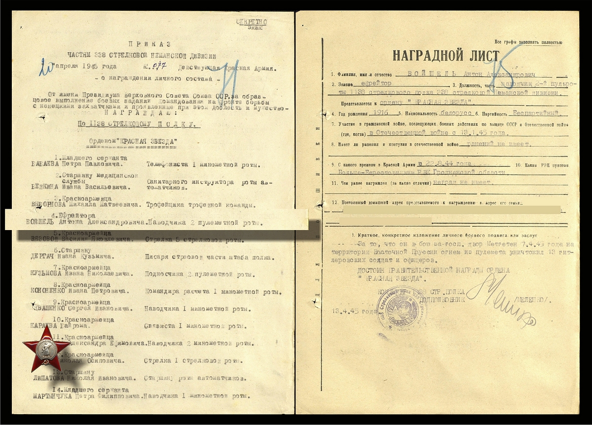 орден Красной Звезды (пр.338сд №077 от 20.04.1945 г.)