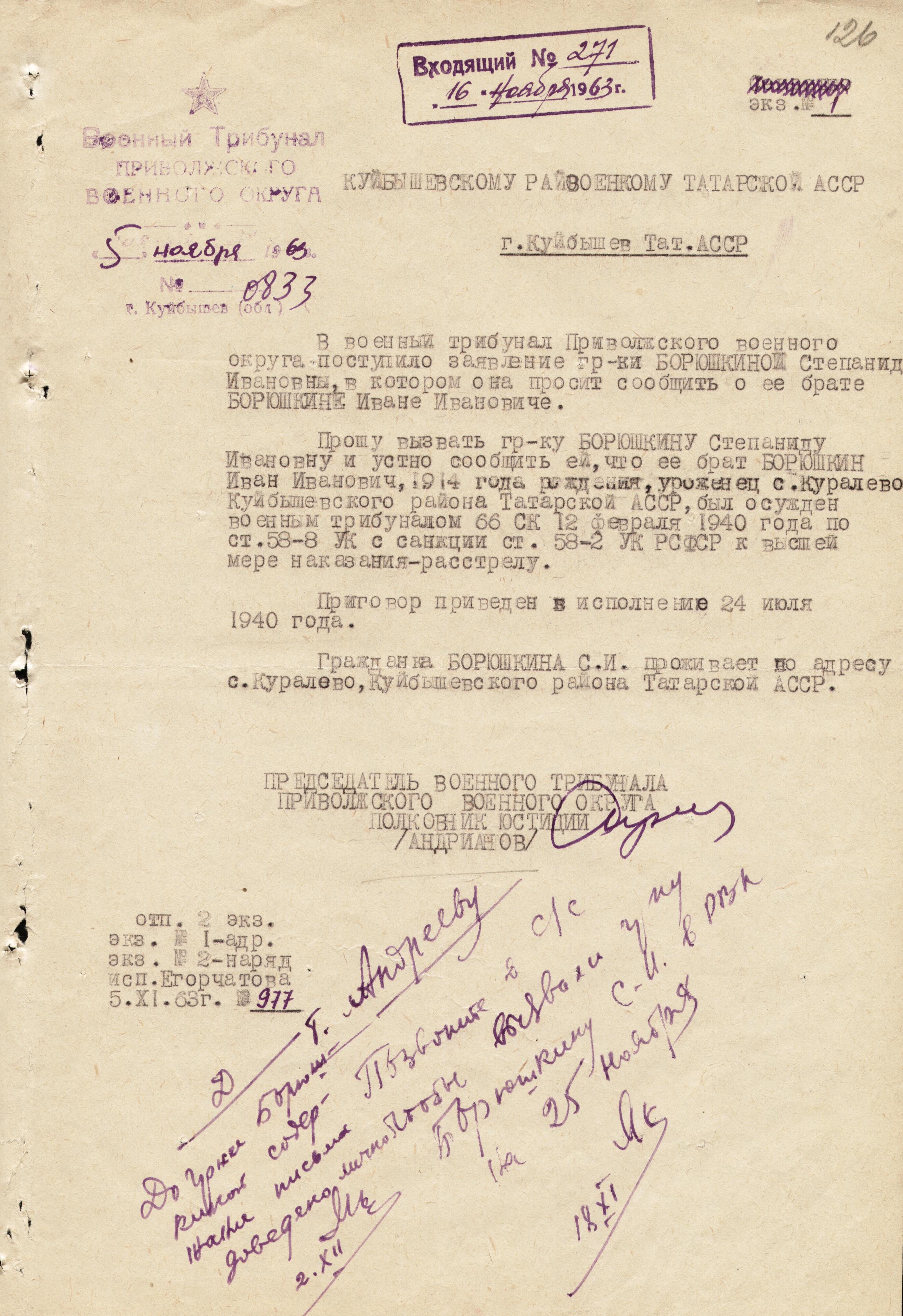 Опубликовано 8 июня, 2009 - 11:50 пользователем Михаил Черепанов Погиб(ла)Книга памяти: Республика Татарстан (ТАССР) Спасский (Куйбышевский, Кузнечихинский) Учетные данные г.р.: 1914область рождения: ТатАССРместо рождения: с.Куралово Куйбышевский районРВК: Куйбышевский РВКзвание: кр-цместо службы: 66 скдень выбытия: 12месяц выбытия: 2год выбытия: 1940причина выбытия: погибгоспиталь: расстрел(58 ст.прим.: 0 Комментарии Re: БОРЮШКИН ИВАН ИВАНОВИЧ Постоянная ссылка (Permalink) Опубликовано 3 декабря, 2013 - 22:06 пользователем Мидхатов Ильхам... Мидхатов Войдите или зарегистрируйтесь, чтобы отправлять комментарии
