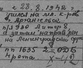 Воинский адрес по последнему письму: Архангельск, почтовый ящик 930-10 -данные ОБД Мемориал. Воинский адрес соответствует 152 отдельному рабочему батальону.