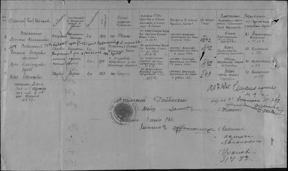 • А если Ваши родственники получали с фронта (из войсковой части) Извещение о его гибели, то это ИЗВЕЩЕНИЕ (ПОХОРОНКА) и сейчас хранится в РВК по месту призыва или проживания родственников.