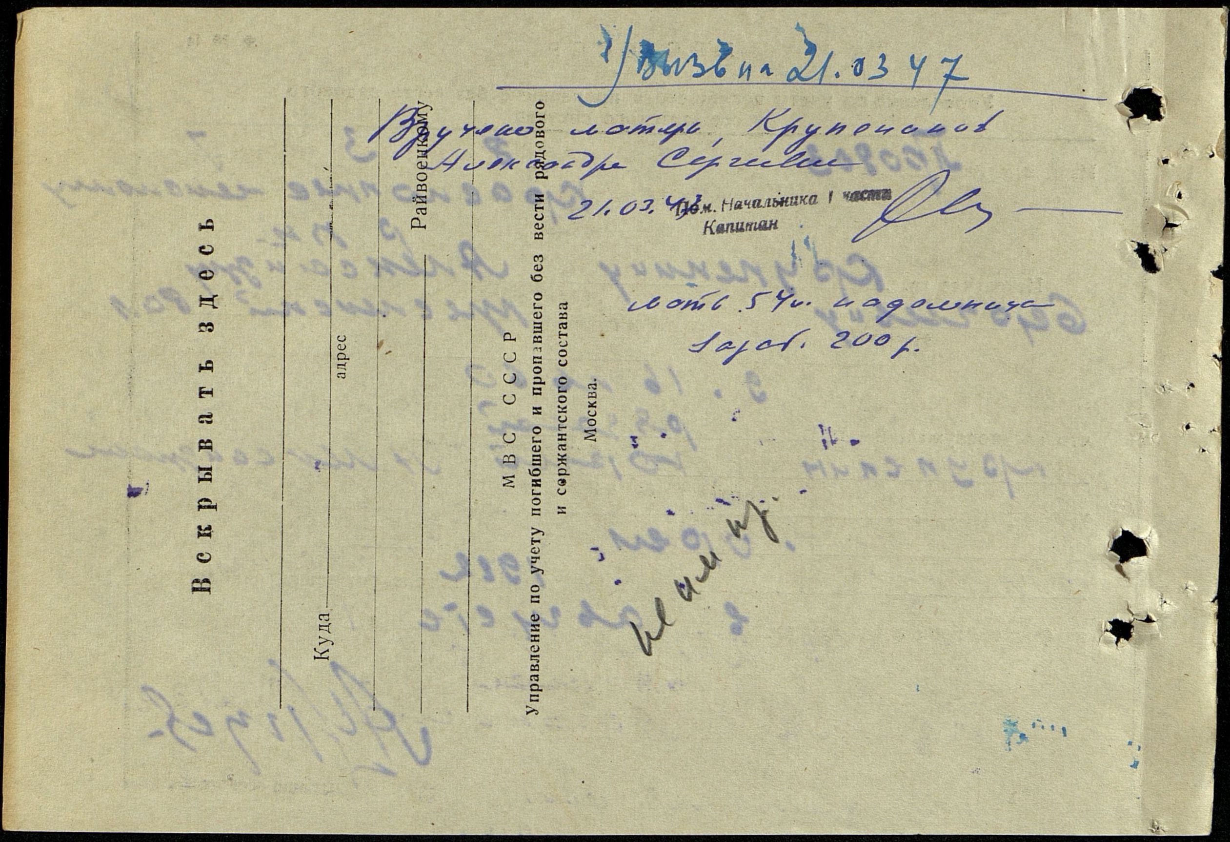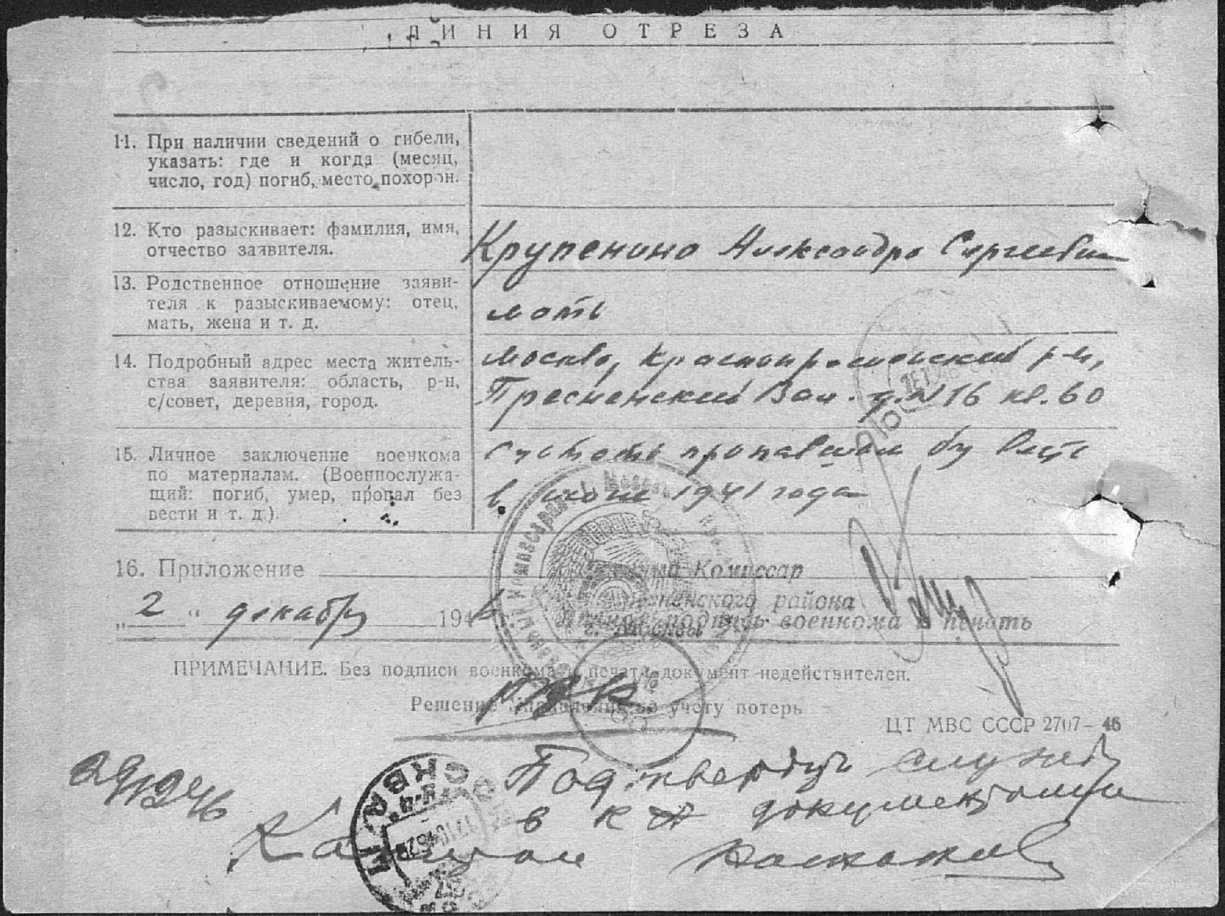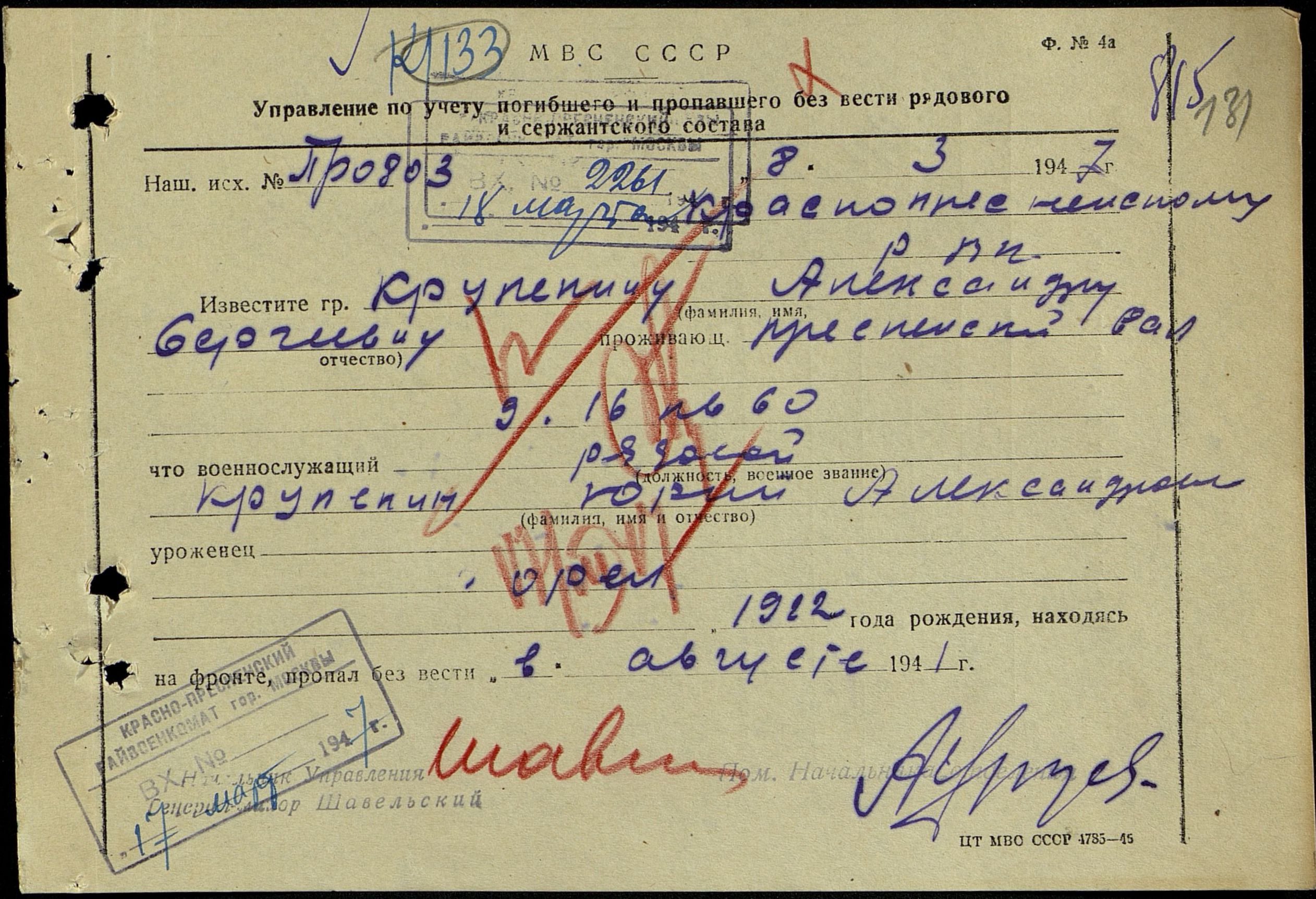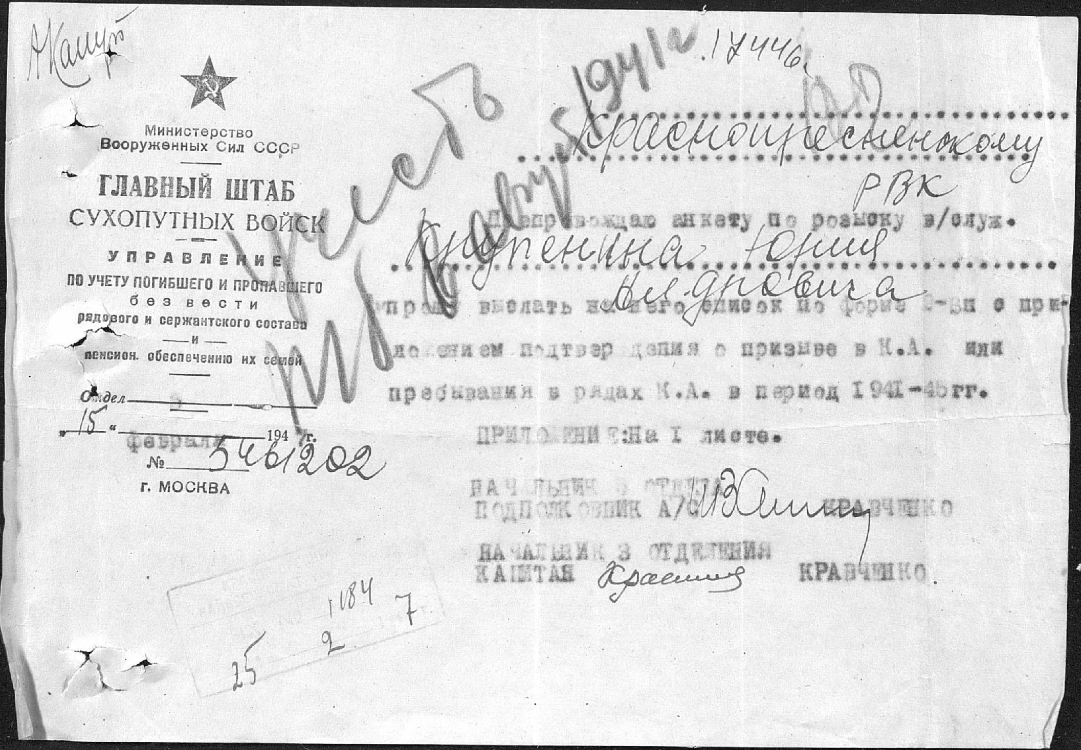 Красноармеец Крупенин Юрий Александрович (1922 г/р) призван в РККА Краснопресненским РВК г. Москвы в 1940 г. Последнее письмо родные получили в июне 1941 г. Службу проходил в Читинской области (ст. Борзя). В письме извещал, что везут на Запад. Считается пропавшим без вести с августа 1941 г.