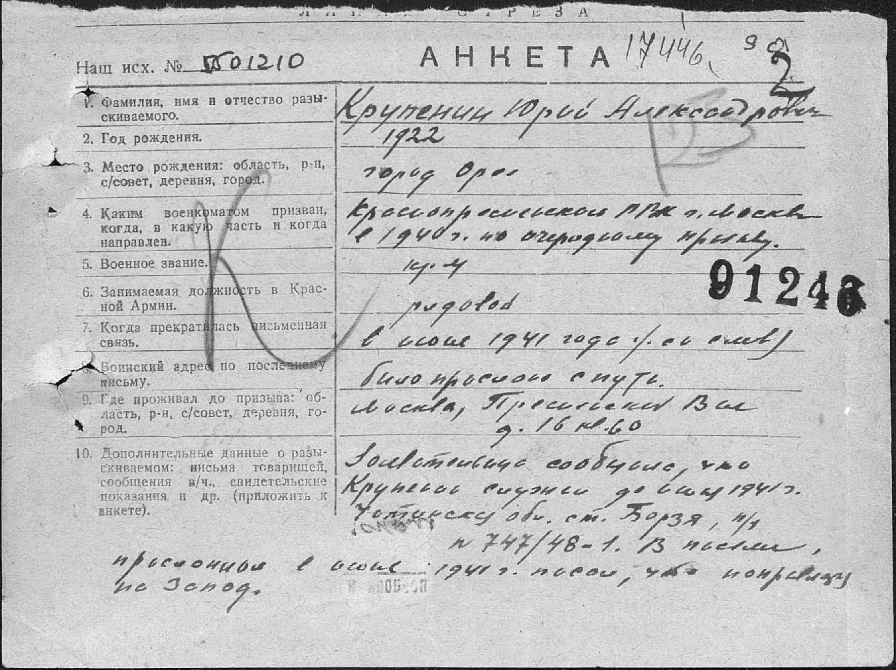 Книга Памяти погибших и пропавших без вести в Великой отечественной войне. Том 7: "...КРУПЕНИН Юрий Александрович, род. 1922 в г. Орёл. Призван Московским ГВК. Красноармеец. Пропал без вести".