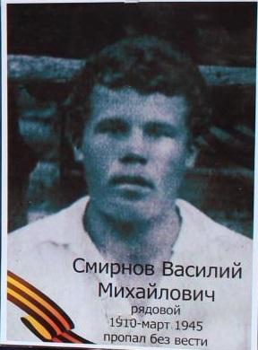 Книга Памяти Тверской области (Весьегонский район): "...СМИРНОВ Василий Михайлович. род. 1910, дер. Мосеевское. Романовский сельсовет. Призван в 1941. Рядовой. Пропал без вести, март 1945".