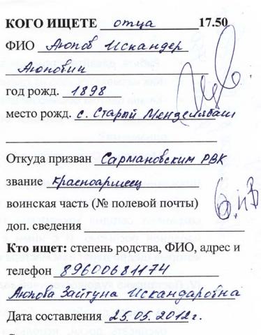 Аюпов Искандер Аюпович, 1898 г.р., с.Старый Мензелябаш Сармановского р-на (от дочери Зайтуны Аюповой)