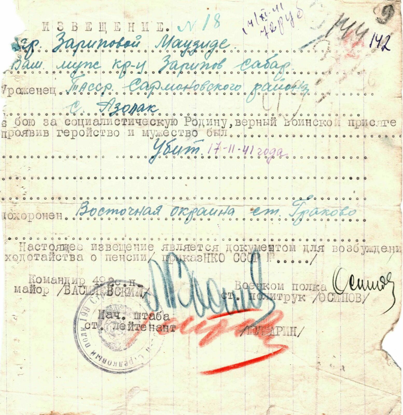 Случайно увидел на ресурсе Вашу инфу! Наш дед Зарипов Сабирзян то же погиб 19.11.41 и как указывает книга памяти, захоронен на ст Граково. Хотя на похоронке указана дата 17.11.41г.