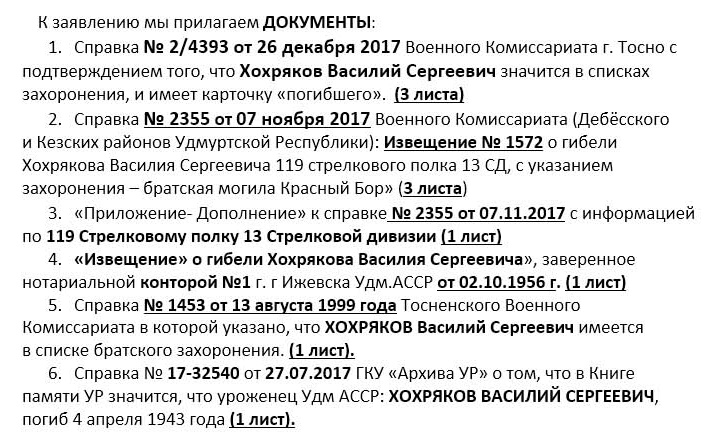 Здравствуйте Марат. Мой дед, Хохряков Василий Сергеевич, погиб 04.04.1943 в Красном Бору. До реконструкции Мемориала, его имея значилось на памятной мраморной плите. После реконструкции, на новых плитах имя его не было отражено. Несмотря на то, что в домашнем семейном архиве сохранилась "похоронка" с указанием места гибели и захоронения, Администрация Красного Бора отказывала нам в восстановлении его имени на новых плитах, Мы стали отстаивать имя нашего деда. Одним из множества документов, собранных нами, был ответ Тосненского Военного Комиссариата - это индивидуальная карточка карточка захоронения Хохрякова В.С. и выписка из общего списка захоронения. Адрес Военный Комиссариат Ленинградской области 187000 г. Тосно, проспект Ленина,54. На сегодняшний день мы имеем письмо от Администрации Красного Бора с обещанием, что имя его будет установлено.