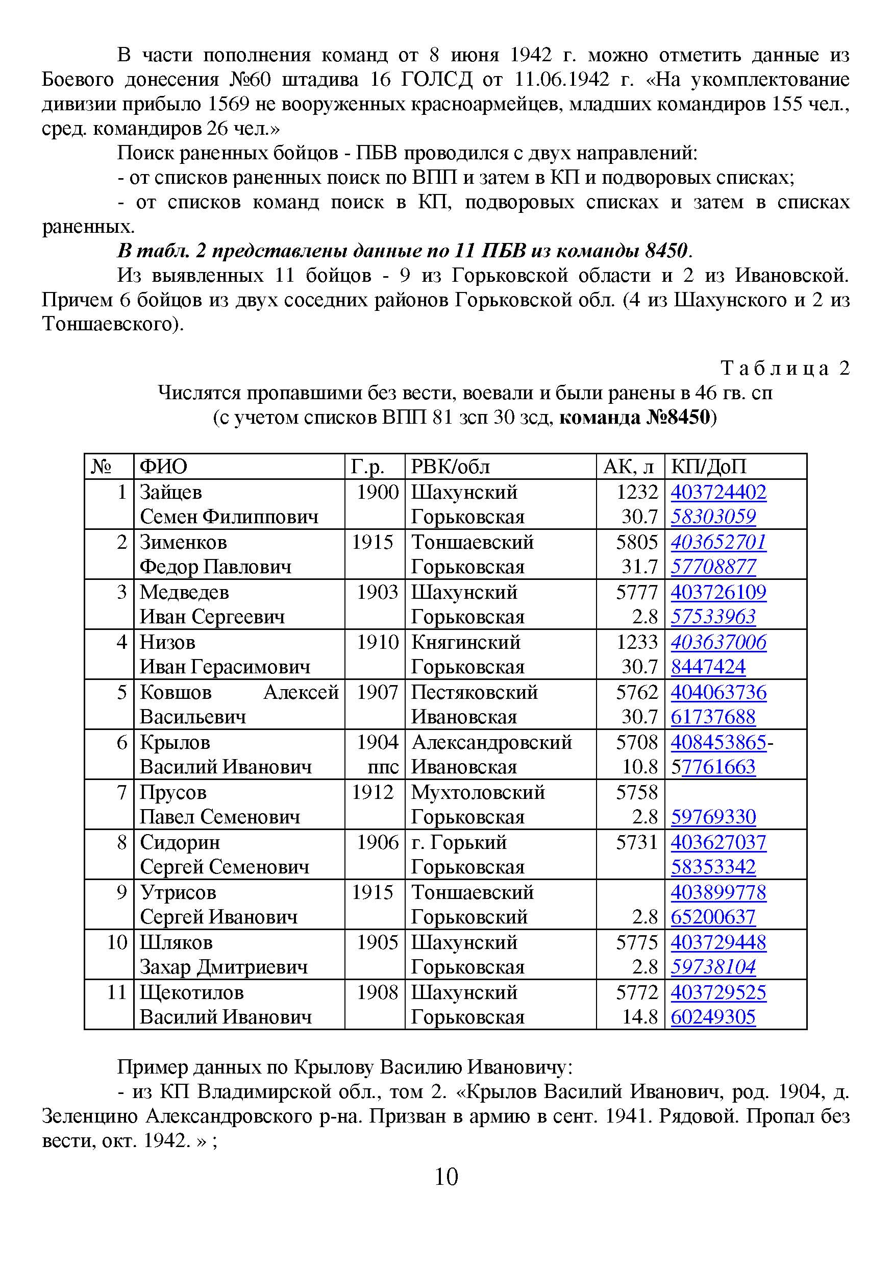 Удачей для проведения исследований было появление в системах «Память народа» и «Мемориал» в начале 2018 г. списков команд военно-пересыльного пункта (ВПП) 81 зсп 30 зсд (ст. Ильино, Нижегородской обл.), которые в значительной степени попали в 16 гв. сд, и в частности в 46 гв. сп (табл. П1.1). В данных списках указан год рождения, дата и место призыва, например, «Крылов Василий Иванович. 1904. 02.05.1942 Александровский РВК, Ивановская обл., Александровский р-н.». Наличие такой информации позволяет соотнести раненного бойца 46 гв. сп с конкретным пропавшим без вести (ПБВ).