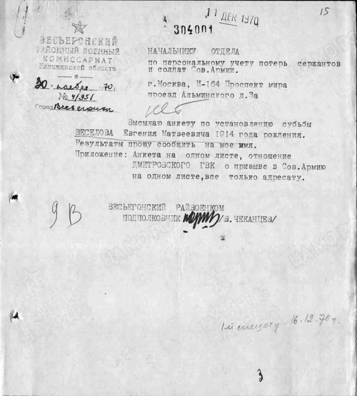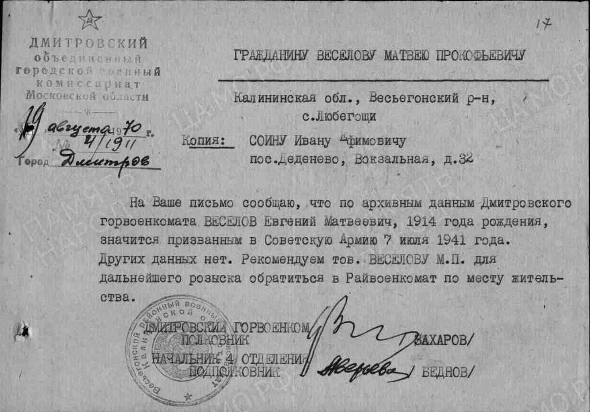 Книга Памяти. Московская область. Том 29, часть 1: "...ВЕСЕЛОВ Евгений Матвеевич, красноармеец, 1914 г. рождения, с. Любегощи Весьегонского р-на Калининской обл. Призван в 1941 г. Дмитровским РВК. Пропал без вести в октябре 1941 г".