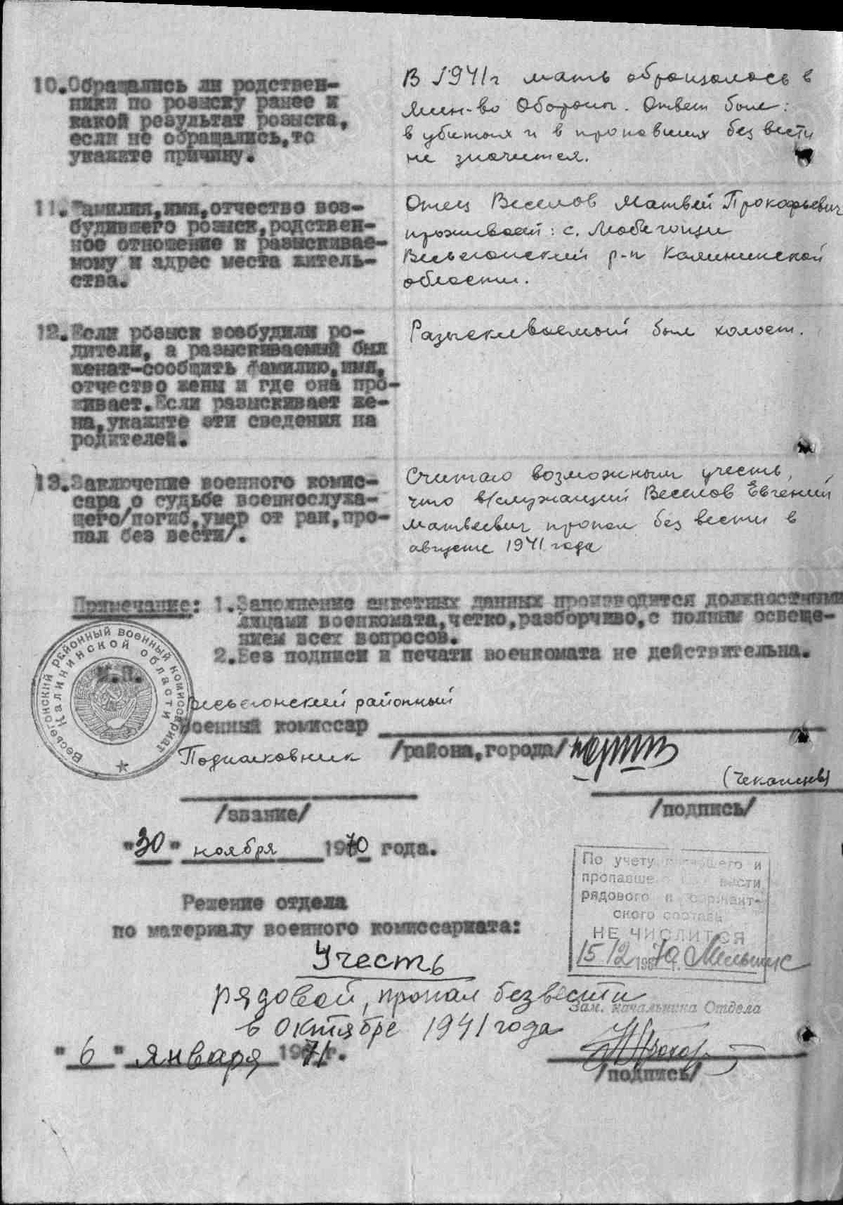 Книга Памяти Тверской области (Весьегонский р-н): "...ВЕСЕЛОВ Евгений Матвеевич. род. 1914, с. Любегощи Любегощинский сельсовет. Призван в 1941. Рядовой. Пропал без вести, октябрь 1941".