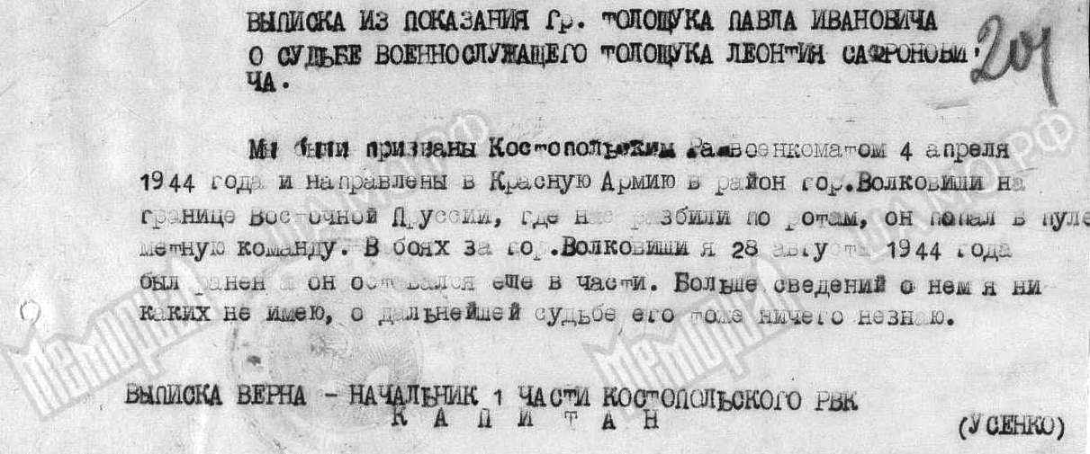 Вернувшийся с фронта живым Талащук П.И., со слов которого записаны сведения в послевоенном донесении подворного опроса о судьбе Талащука Л.С.,