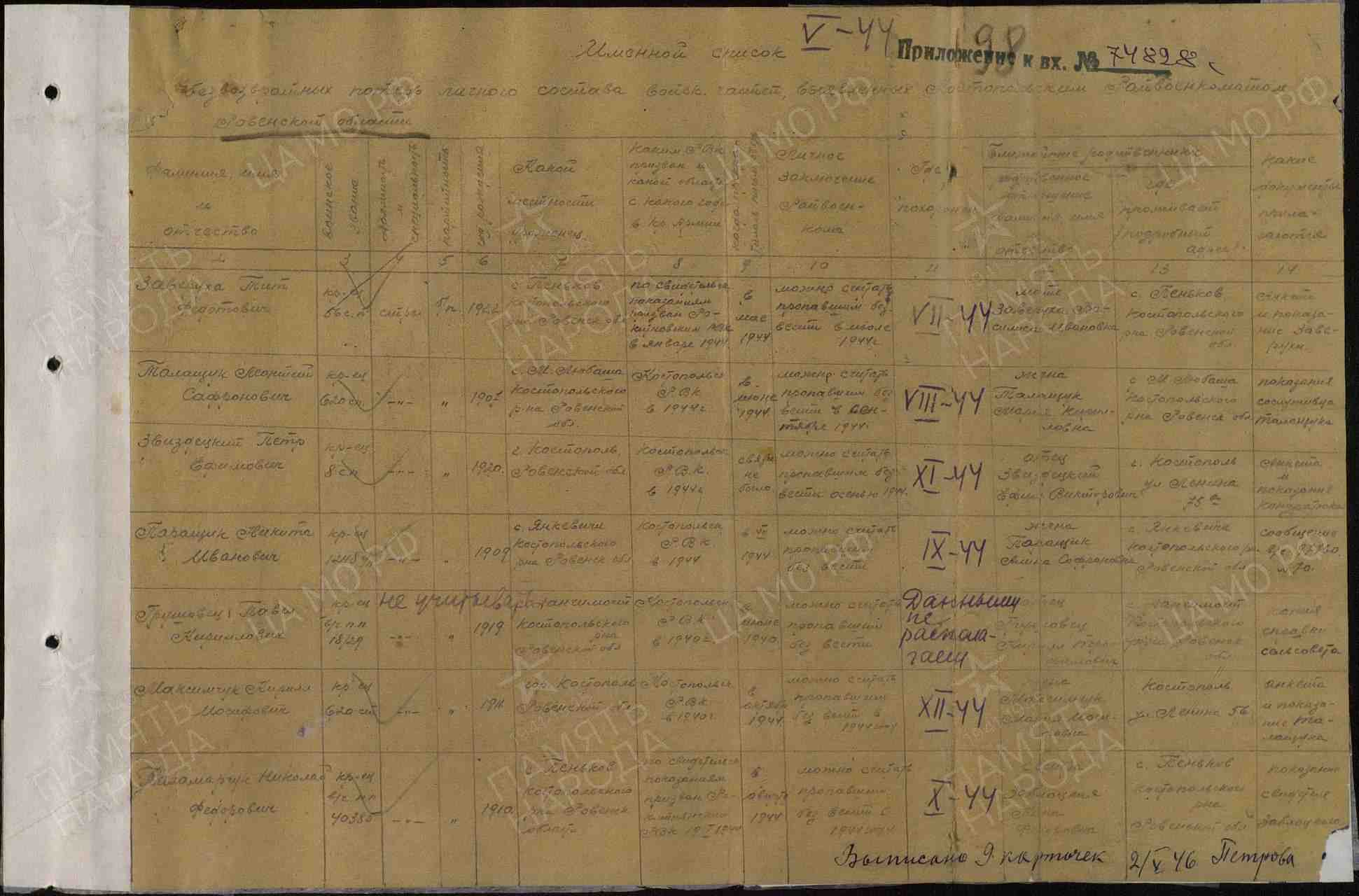 Дата и место призыва 05.05.1944 Ростопольский РВК, Украинская ССР, Ровенская обл., Ростопольский р-н