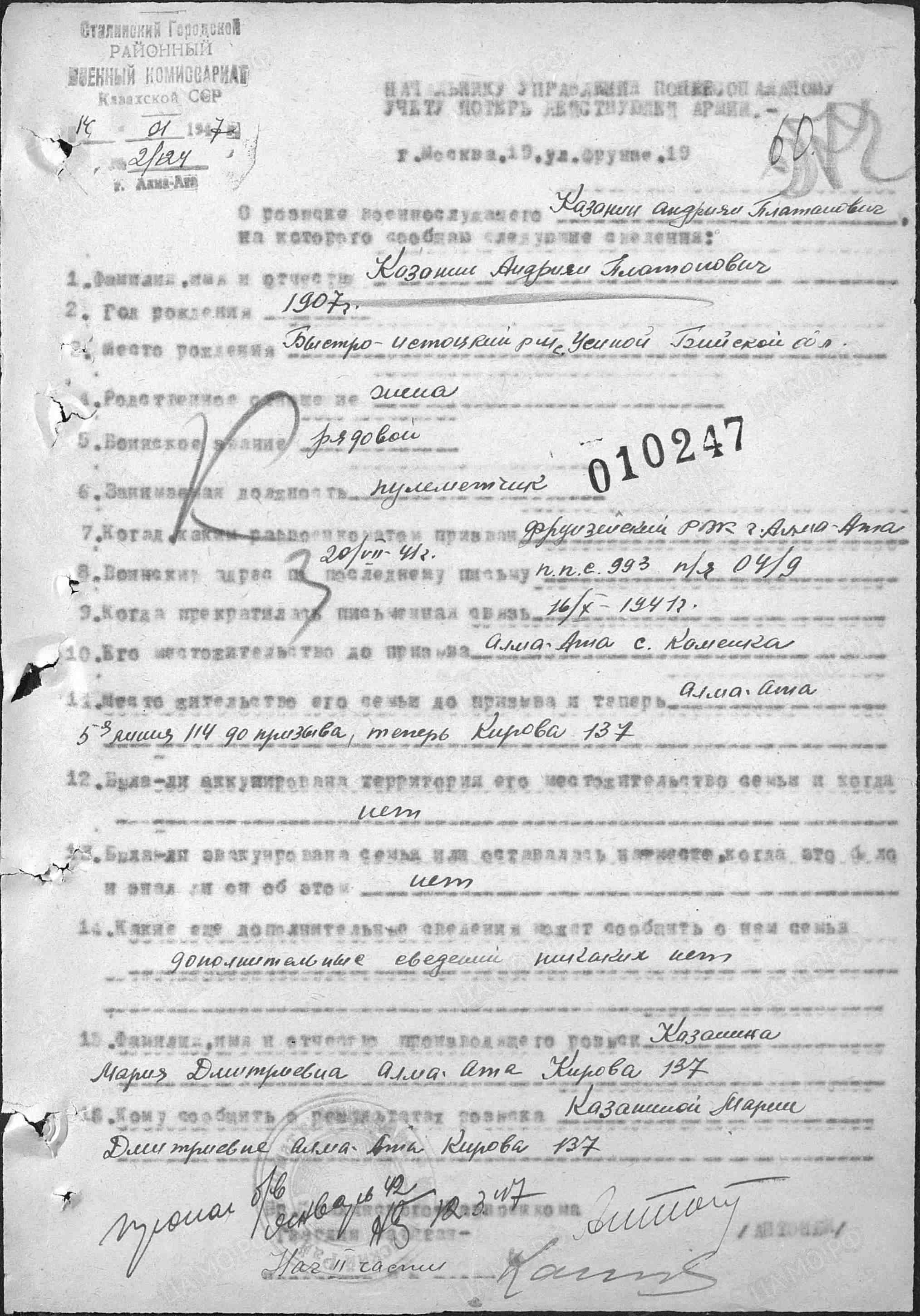 Опубликовано 1 июля, 2019 - 04:44 пользователем Natalia_star1977 Пропал(а) без вестиКнига памяти: Республики СССР Казахская ССР (Казахстан) г. Алма-Ата Учетные данные г.р.: 1907область рождения: Бийская областьместо рождения: Быстро-Истоцкий р-н, с. Усинойместо жительства до призыва: РК Алма-Ата ул.5 линия (после войны Кирова) дом 114РВК: Фрунзенский РВК, Казахская ССР, г. Алма-Атазвание: рядовойдолжность: пулеметчикместо службы: 316 сд (1ф), 8 гв. сд ппс 993 п/я 04/9месяц выбытия: 1год выбытия: 1942причина выбытия: пропал без вестиопись: 977520дело: 3226 Жена Казанина Мария Дмитриевна Дети: Петр, Валентина, Зоя Изображение: Комментарии Re: КАЗАНИН АНДРЕЙ (АНДРЕЯН) ПЛАТОНОВИЧ Постоянная ссылка (Permalink) Опубликовано 1 июля, 2019 - 09:08 пользователем Хатира Мансуровна Справочник полевых почтовых станций РККА в 1941-1945 годах. Полевая почтовая станция №0993 Название: 316 сд (1ф), 8 гв. сд Родиться человеком - это чудо. Остаться человеком - это труд. Войдите или зарегистрируйтесь, чтобы отправлять комментарии Re: КАЗАНИН АНДРЕЙ (АНДРЕЯН) ПЛАТОНОВИЧ Постоянная ссылка (Permalink) Опубликовано 1 июля, 2019 - 10:04 пользователем Natalia_star1977 спасибо вам огромное Войдите или зарегистрируйтесь, чтобы отправлять комментарии