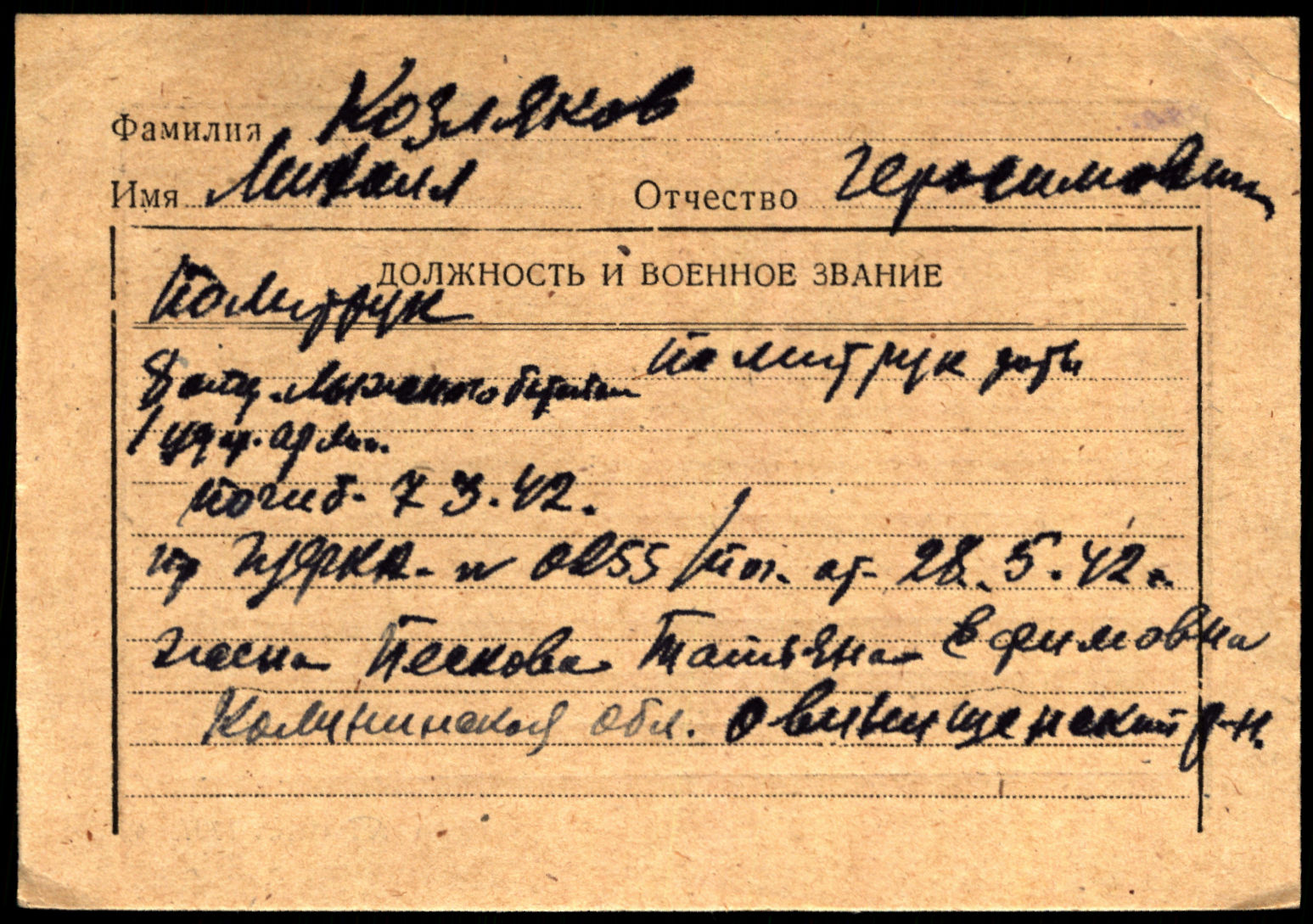 Книга Памяти Тверской области (Весьегонский район): "...КОЗЛЯКОВ Михаил Герасимович. род. г. Весьегонск. Политрук роты, Погиб 7 марта 1942. Похоронен: дер. Черная Ленинградской области".