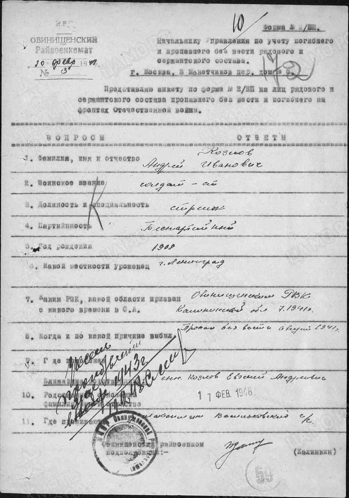 Книга Памяти Тверской области (Весьегонский район): "...КОЗЛОВ Андрей Иванович. род. 1908, г. Санкт-Петербург. Призван в 1941. Рядовой. Пропал без вести, май 1943".