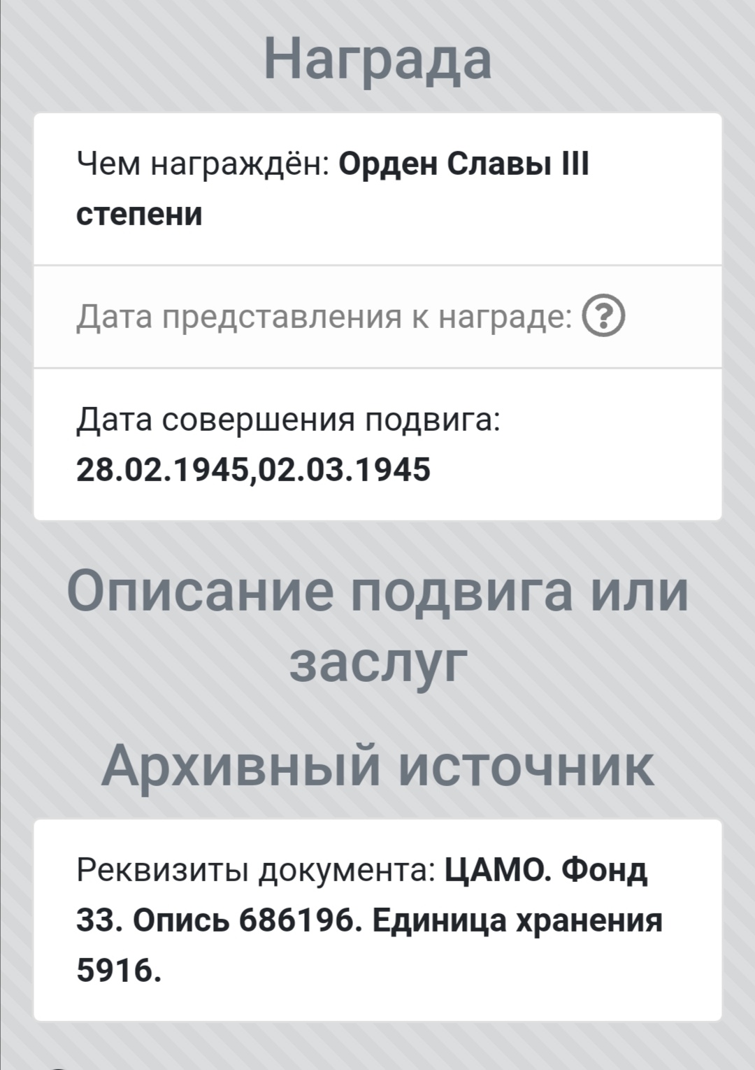 Опубликовано 29 марта, 2020 - 13:54 пользователем екате рина Вернулся(лась)Книга памяти: Челябинская область Чебаркульский район Учетные данные г.р.: 1924область рождения: Тамбовская область Комментарии Re: ШАМШУРИН НИКОЛАЙ НИКОЛАЕВИЧ Постоянная ссылка (Permalink) Опубликовано 7 мая, 2022 - 19:44 пользователем Sergey Shamshurin Шамшурин Николай Николаевич 1925г.р Тамбовская область, село Кужное. Отец - Шамшурин Николай Митрофанович 1900 г.р родился на праздник Никола Изображение: Войдите или зарегистрируйтесь, чтобы отправлять комментарии