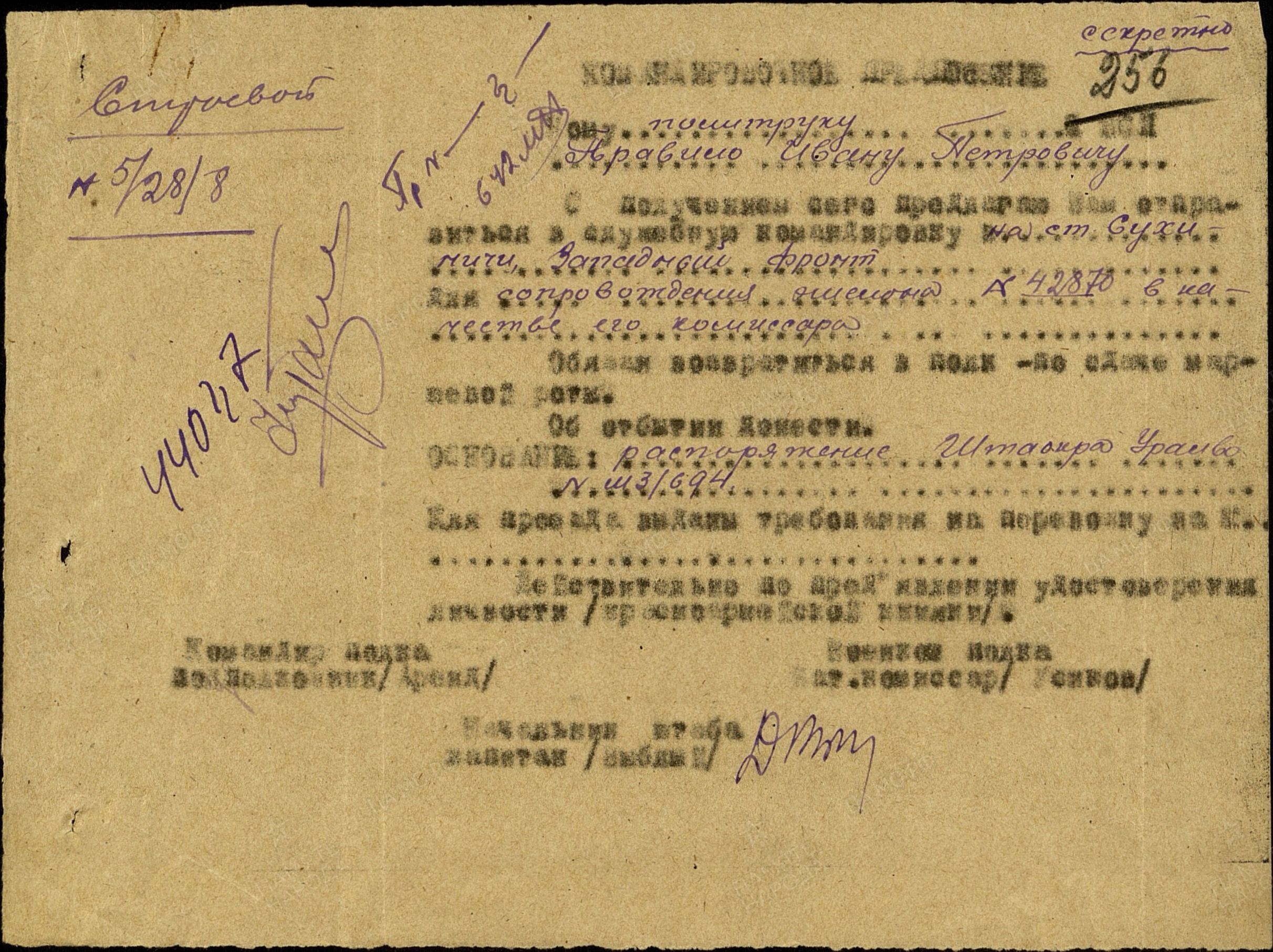 направлен на станцию Сухиничи, эшелон №42970, распоряжением №МЗ/694 от 28.08.1942