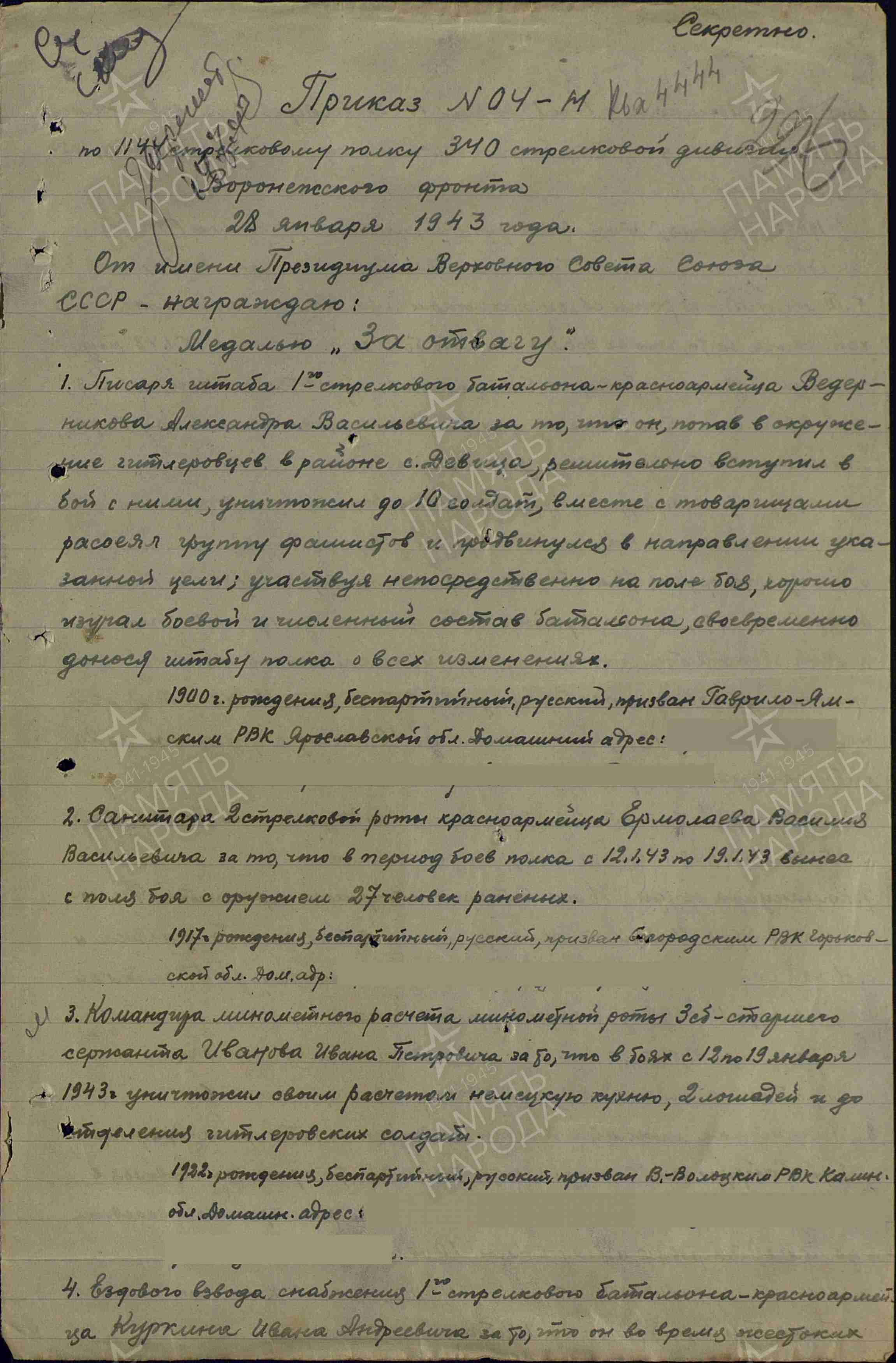 Служил в 1144 стрелковом полку 340 стрелковой дивизии Воронежского Фронта.