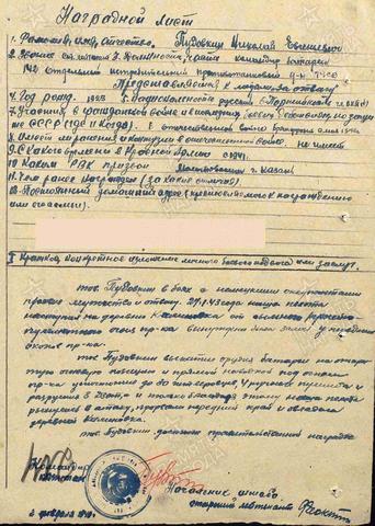 Награжден медалью "За отвагу" 4 февраля 1943 г. за то, что 27 января при освобождении д.Калиновка в Орловской обл. под шквальным огнем выкатил орудие и прямой наводкой уничтожил 4 ручных пулемета, 8 ДЗОТов и до 30 гитлеровцев.