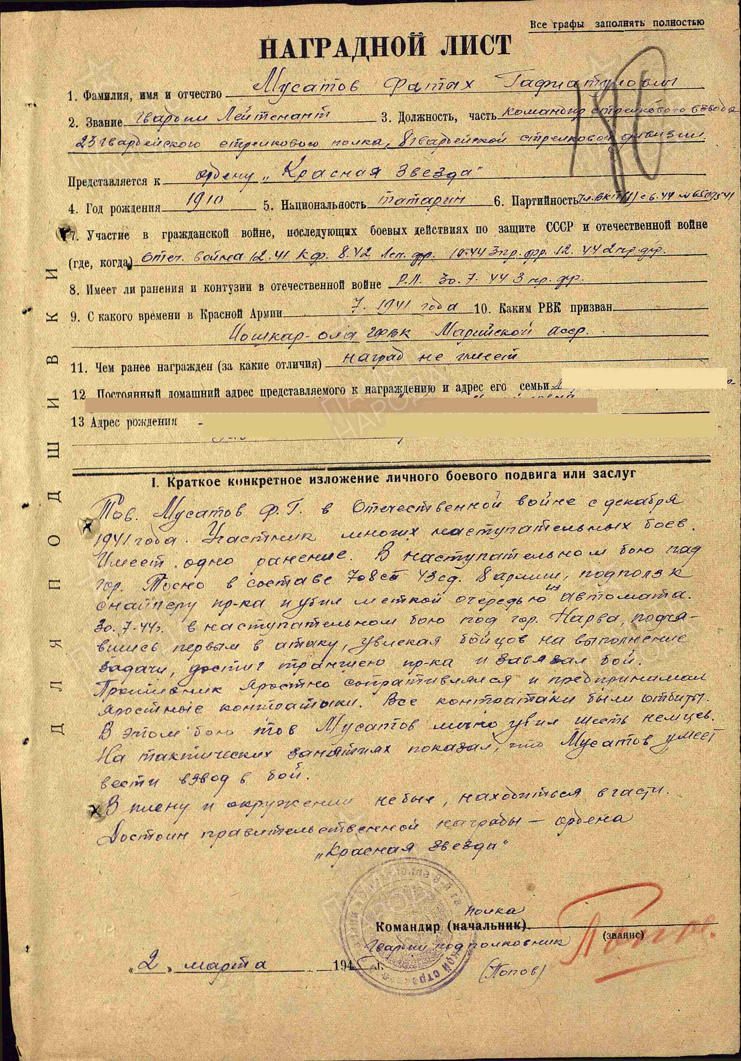 Родился в 1910 г. в Чердаклинском р-не Ульяновской обл. Татарин. Мобилизован Йошкар-Олинским ГВК Марий Эл в июля 1941 г.