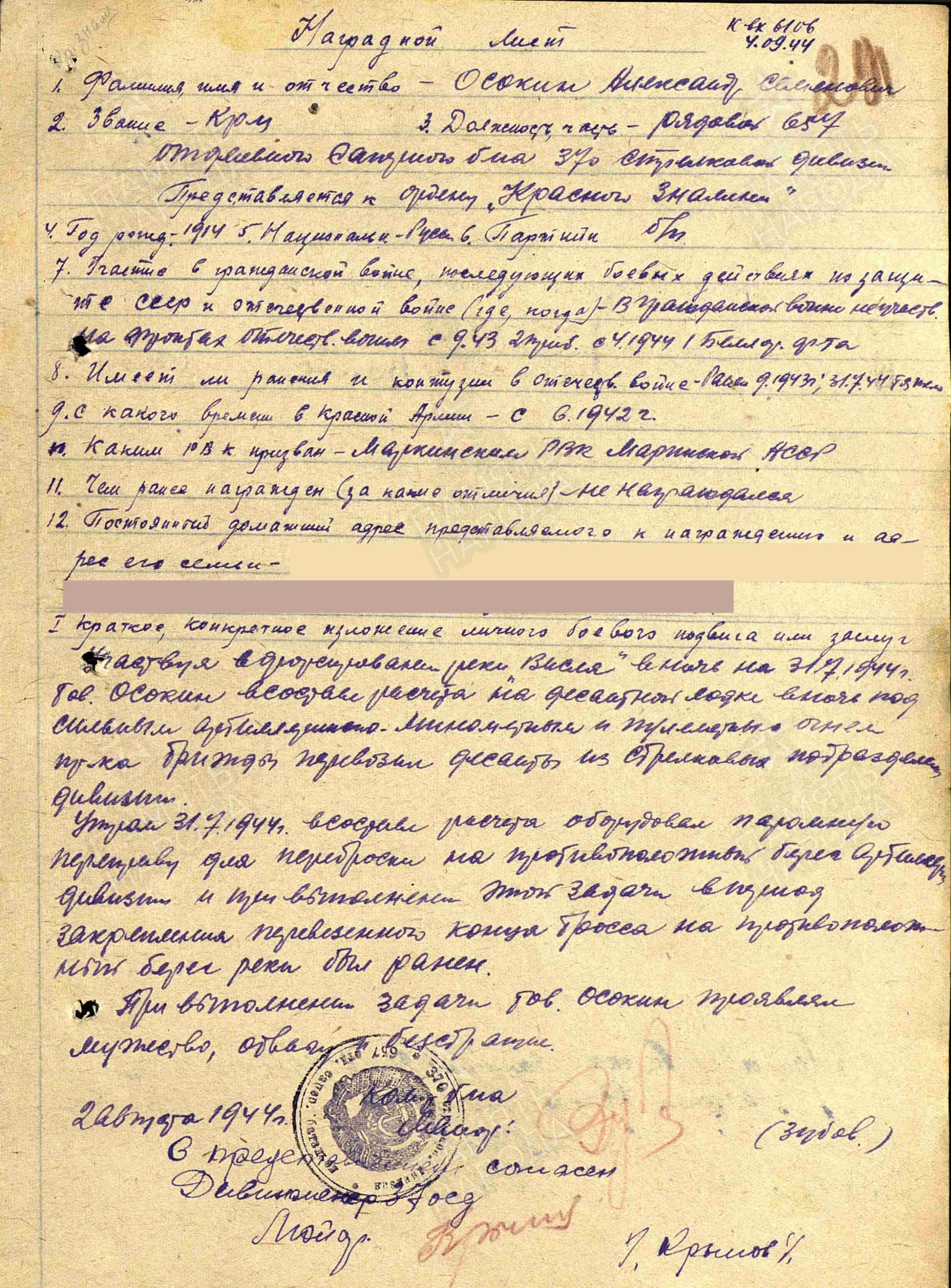 ОСОКИН АЛЕКСЕЙ, г.р. 1909, Столбищенский р-н, моб. Столбищенским РВК, 789 сп,227 сд, шталаг IX E(в плен:44, д. 6252