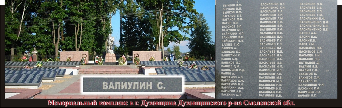 261330815 Информация из списков захоронения Фамилия Валиулин Имя Самигула Отчество Воинское звание рядовой Дата смерти 14.09.1943 Страна захоронения Россия Регион захоронения Смоленская обл. Место захоронения Духовщинский р-н, г. Духовщина https://www.obd-memorial.ru/html/info.htm?id=261330815